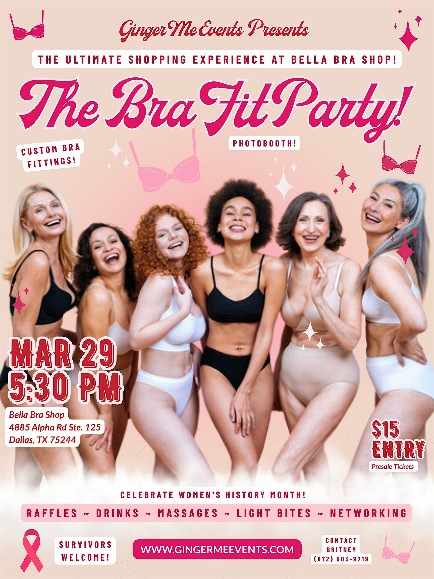 by admin24Feb Custom Bra Fit Party at Bella Bra Shop at Bella Bra Shop – Dallas, TX Custom Bra Fit Party at Bella Bra Shop at Bella Bra Shop – Dallas, TX 2 2 people viewed this event. Join us for a fun and informative Bra Fit Party! The Ultimate Bra Shopping Experience with the girls. Custom bra fittings! Tickets-RSVP Link Date And Time Sunday, March 29th, 2026 @ 05:00 PM Location 4885 Alpha Road, Dallas, TX 75244 Event Types Fashion & BeautyParty or Social Gathering Event Category DallasTexas Share With Friends Facebook Twitter Linkedin Xing Pinterest Share This Post: