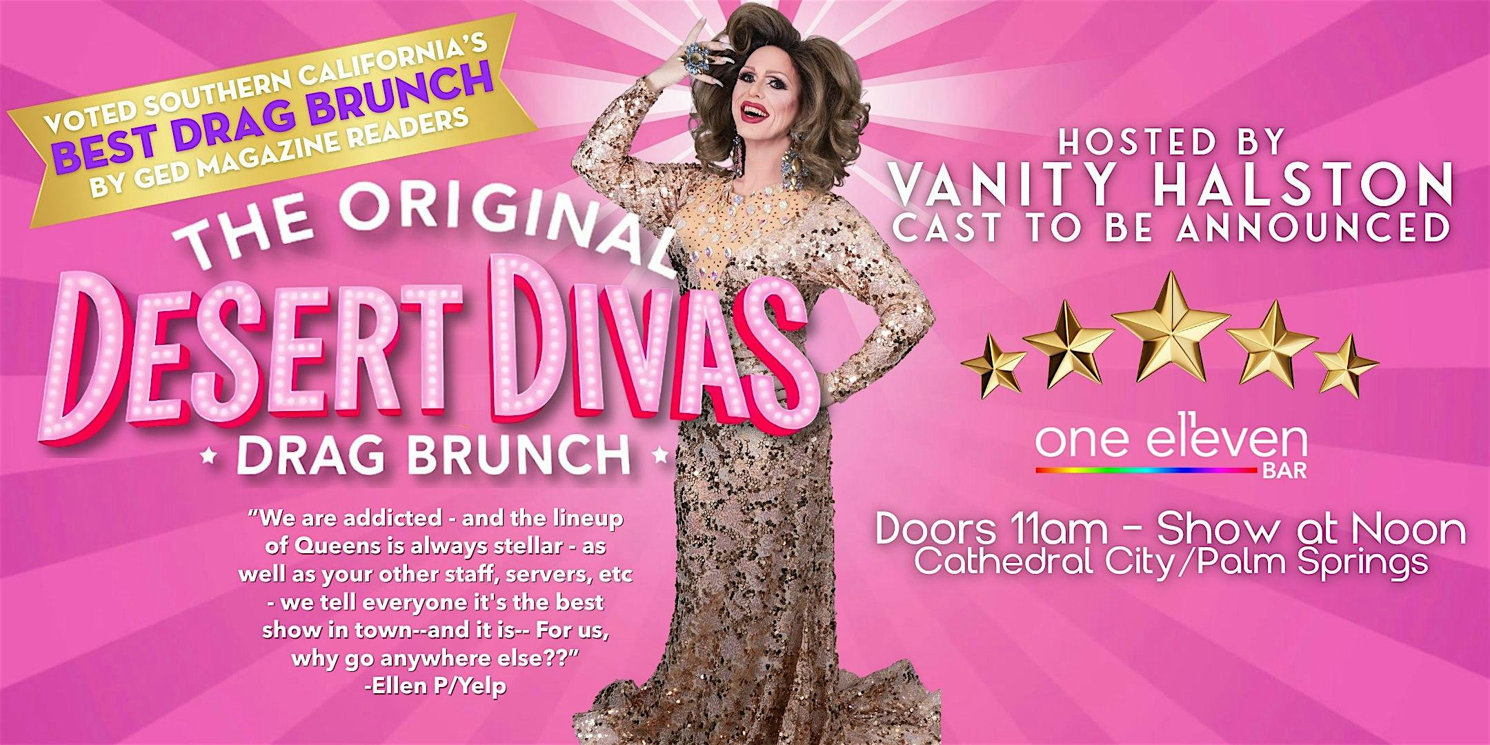 by admin24Feb Desert Divas Drag Brunch with Vanity Halston – March 29th at one eleven bar – Cathedral City, CA Desert Divas Drag Brunch with Vanity Halston – March 29th at one eleven bar – Cathedral City, CA 7 7 people viewed this event. Voted Southern California’s BEST DRAG BRUNCH by GED Magazine and hosted by Palm Springs legend Vanity Halston! Tickets-RSVP Link Date And Time Sunday, March 29th, 2026 @ 12:00 PM Location 67555 East Palm Canyon Drive, Cathedral City, CA 92234 Event Types Party or Social GatheringPerforming & Visual Arts Event Category California Share With Friends Facebook Twitter Linkedin Xing Pinterest Share This Post: