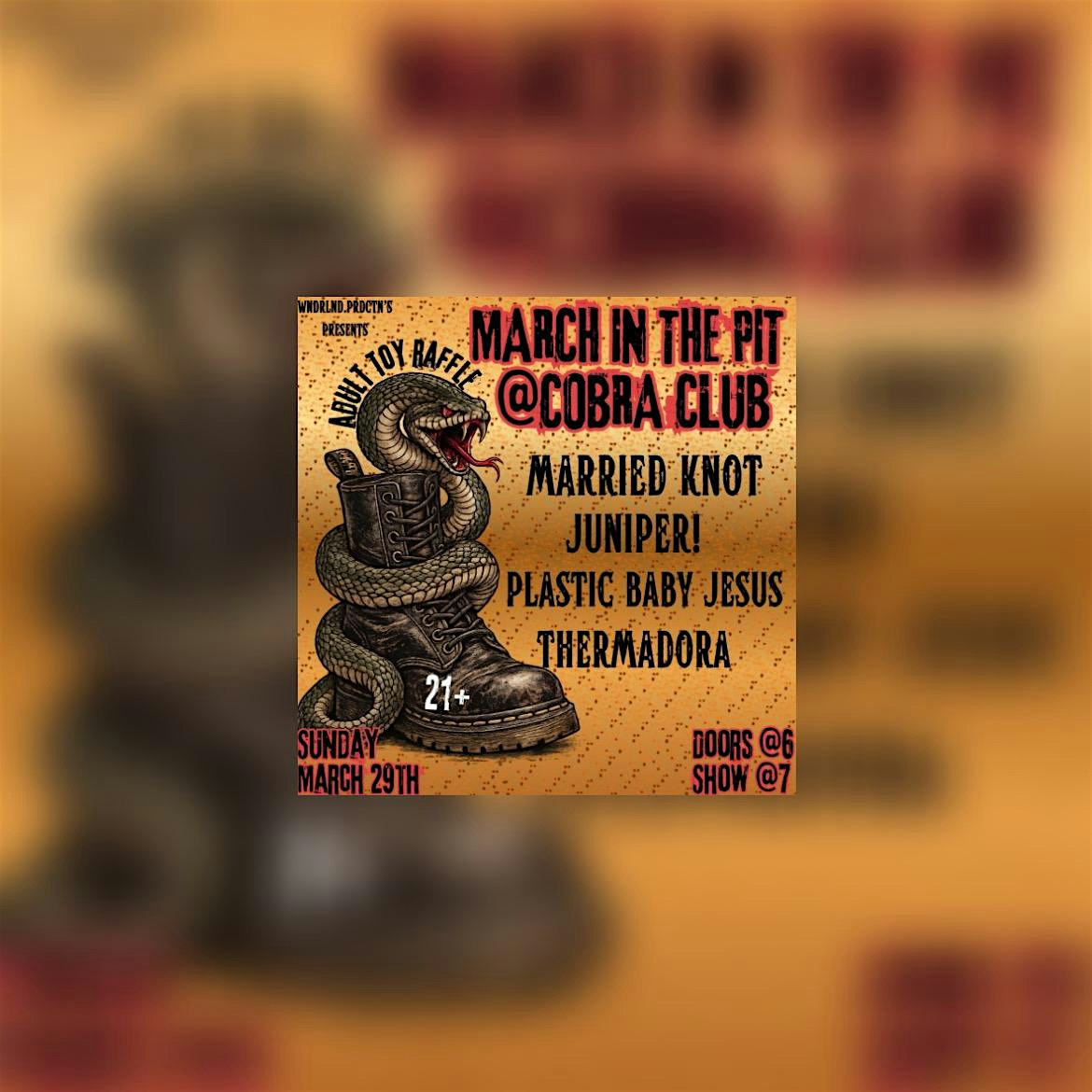 by admin27Feb MARCH IN THE PIT at The Cobra Club – Brooklyn, NY MARCH IN THE PIT at The Cobra Club – Brooklyn, NY 2 2 people viewed this event. Four sick bands. One unhinged night. Wear your Docs & eyeliner—Plastic Baby Jesus, Juniper!, Thermadora & Married Knot take over Cobra Club. Tickets-RSVP Link Date And Time Sunday, March 29th, 2026 06:00 PM (PST) Venue The Cobra Club Location 6 Wyckoff Avenue, Brooklyn, NY 11237 Event Types Concert or PerformanceMusic Event Category New York Share With Friends Facebook Twitter Linkedin Xing Pinterest Share This Post: