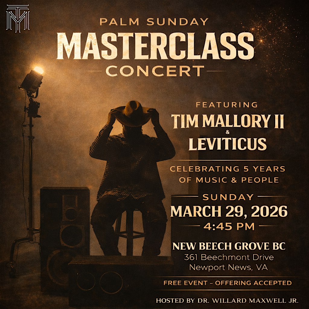 by admin24Feb Palm Sunday: A Masterclass Concert with Tim Mallory II & Leviticus at New Beech Grove Baptist Church – Newport News, VA Palm Sunday: A Masterclass Concert with Tim Mallory II & Leviticus at New Beech Grove Baptist Church – Newport News, VA 3 3 people viewed this event. Join Tim Mallory II & Leviticus LIVE for an epic Palm Sunday masterclass concert you don’t wanna miss! Tickets-RSVP Link Date And Time Sunday, March 29th, 2026 04:00 PM (PST) Venue New Beech Grove Baptist Church Location 361 Beechmont Drive, Newport News, VA 23608 Event Types Concert or PerformanceMusic Event Category Virginia Share With Friends Facebook Twitter Linkedin Xing Pinterest Share This Post: