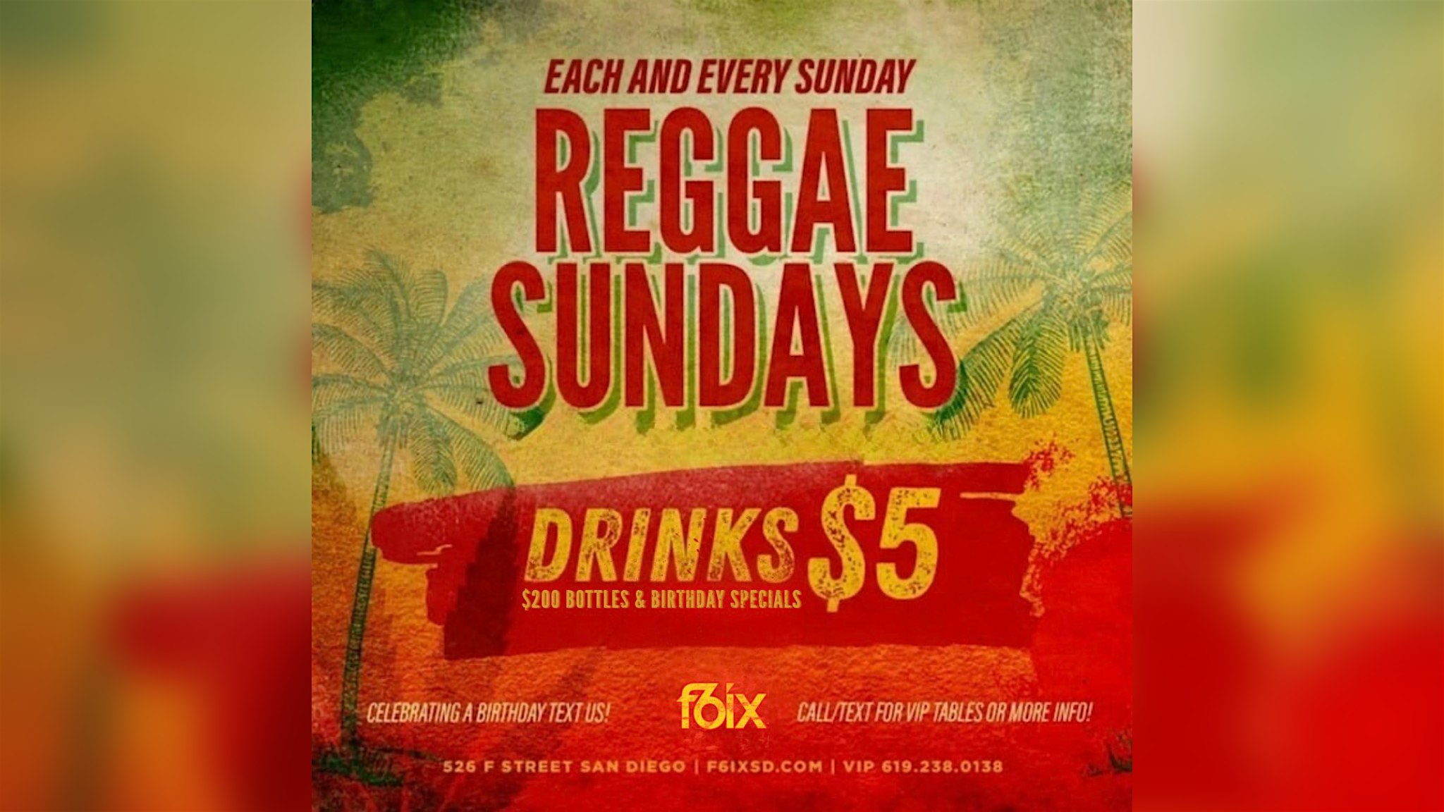 by admin24Feb REGGAE SUNDAYS AT F6IX | MARCH 29TH EVENT at F6ix – San Diego, CA REGGAE SUNDAYS AT F6IX | MARCH 29TH EVENT at F6ix – San Diego, CA 2 2 people viewed this event. Reggae Sundays at F6ix! Come dance and enjoy our Drink Specials and More! Tickets-RSVP Link Date And Time Sunday, March 29th, 2026 09:00 PM (PST) Venue F6ix Location 526 F Street, San Diego, CA 92101 Event Types Concert or PerformanceMusic Event Category CaliforniaSan Diego Share With Friends Facebook Twitter Linkedin Xing Pinterest Share This Post: