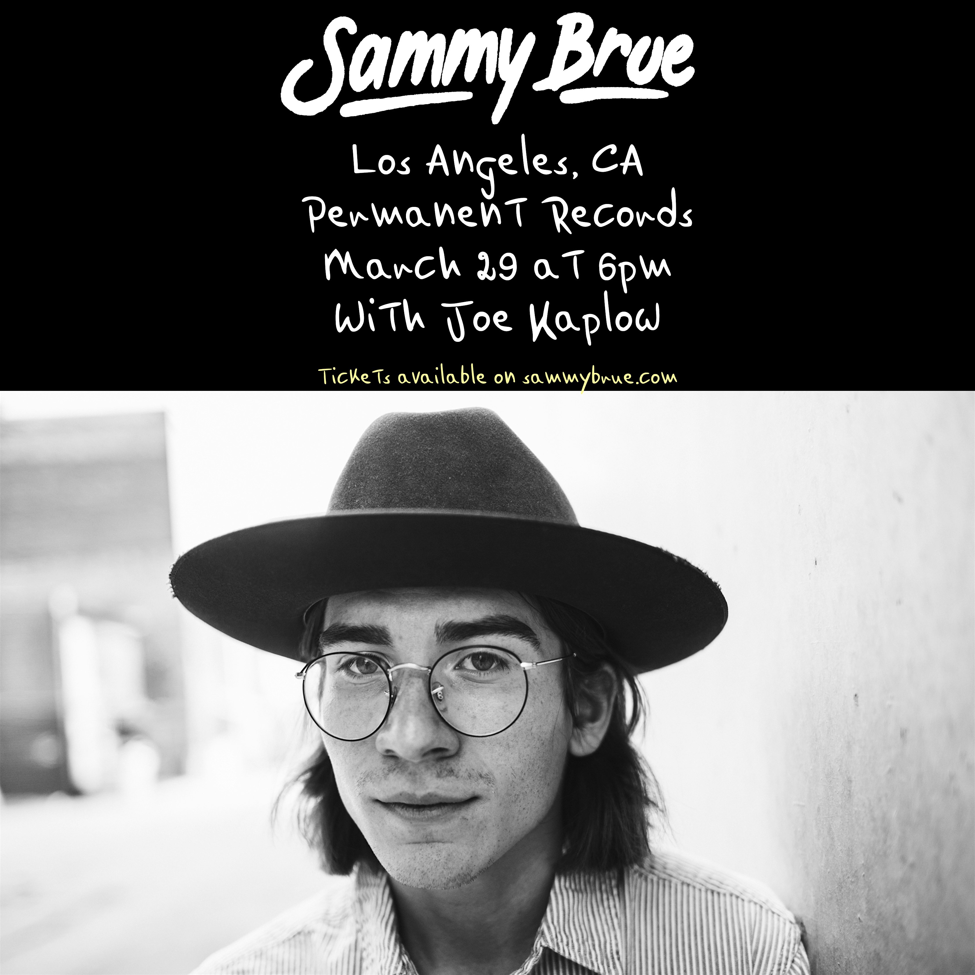 by admin24Feb Sammy Brue, Joe Kaplow at Permanent Records Roadhouse – Los Angeles, CA Sammy Brue, Joe Kaplow at Permanent Records Roadhouse – Los Angeles, CA 2 2 people viewed this event. This event is 21+ only. We will check IDs at the door. There are no refunds if you are turned away. Tickets-RSVP Link Date And Time Sunday, March 29th, 2026 06:00 PM (PST) Venue Permanent Records Roadhouse Location 1906 Cypress Avenue, Los Angeles, CA 90065 Event Types Concert or PerformanceMusic Event Category CaliforniaLos Angeles Share With Friends Facebook Twitter Linkedin Xing Pinterest Share This Post: