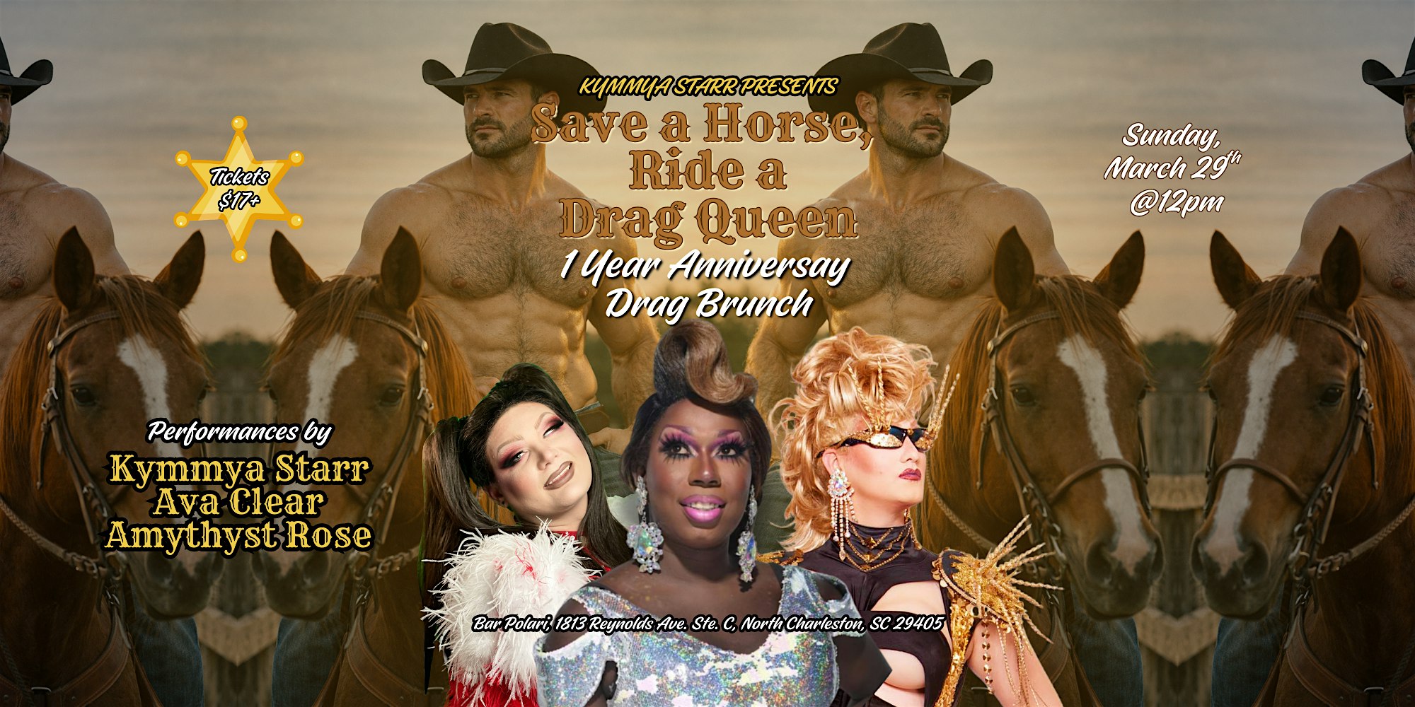 by admin27Feb Save a Horse ride a Drag Queen Brunch one year Anniversary!! at Bar Polari – North Charleston, SC Save a Horse ride a Drag Queen Brunch one year Anniversary!! at Bar Polari – North Charleston, SC 2 2 people viewed this event. Saddle up for drag, drinks, and laughs at the wildest brunch in town—Save a Horse, Ride a Drag Queen! Tickets-RSVP Link Date And Time Sunday, March 29th, 2026 @ 12:00 PM Location 1813 Reynolds Avenue, North Charleston, SC 29405 Event Types Food & DrinkParty or Social Gathering Event Category CharlestonSouth Carolina Share With Friends Facebook Twitter Linkedin Xing Pinterest Share This Post: