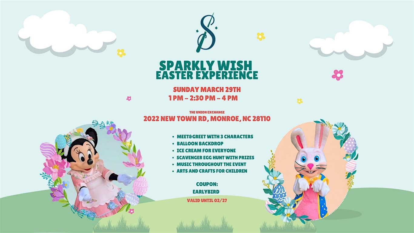 by admin23Feb Sparkly Wish Easter Experience at The Union Exchange – Monroe, NC Sparkly Wish Easter Experience at The Union Exchange – Monroe, NC 2 2 people viewed this event. Easter fun on March 29! Meet 3 characters, enjoy ice cream, crafts, music, a scavenger egg hunt with prizes, and a balloon photo backdrop. Tickets-RSVP Link Date And Time Sunday, March 29th, 2026 01:00 PM (PST) Venue The Union Exchange Location 2022 New Town Road, Monroe, NC 28110 Event Types Party or Social GatheringSeasonal & Holiday Event Category North Carolina Share With Friends Facebook Twitter Linkedin Xing Pinterest Share This Post: