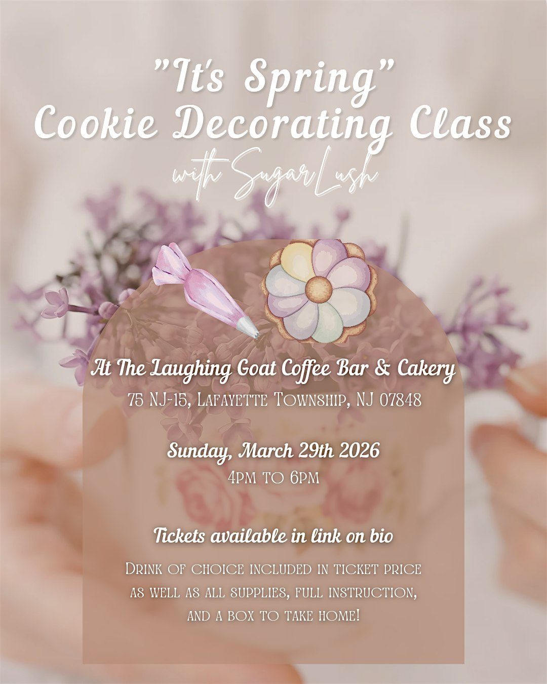 by admin24Feb Spring Time Cookie Decorating Class at The Laughing Goat Coffee Bar & Cakery – Lafayette Township, NJ Spring Time Cookie Decorating Class at The Laughing Goat Coffee Bar & Cakery – Lafayette Township, NJ 1 1 people viewed this event. We are back at The Laughing Goat with hands on full instruction sugar cookie decorating ! Tickets-RSVP Link Date And Time Sunday, March 29th, 2026 04:00 PM (PST) Venue The Laughing Goat Coffee Bar & Cakery Location 75 New Jersey 15, Lafayette Township, NJ 7848 Event Types Food & Drink Event Category New Jersey Share With Friends Facebook Twitter Linkedin Xing Pinterest Share This Post: