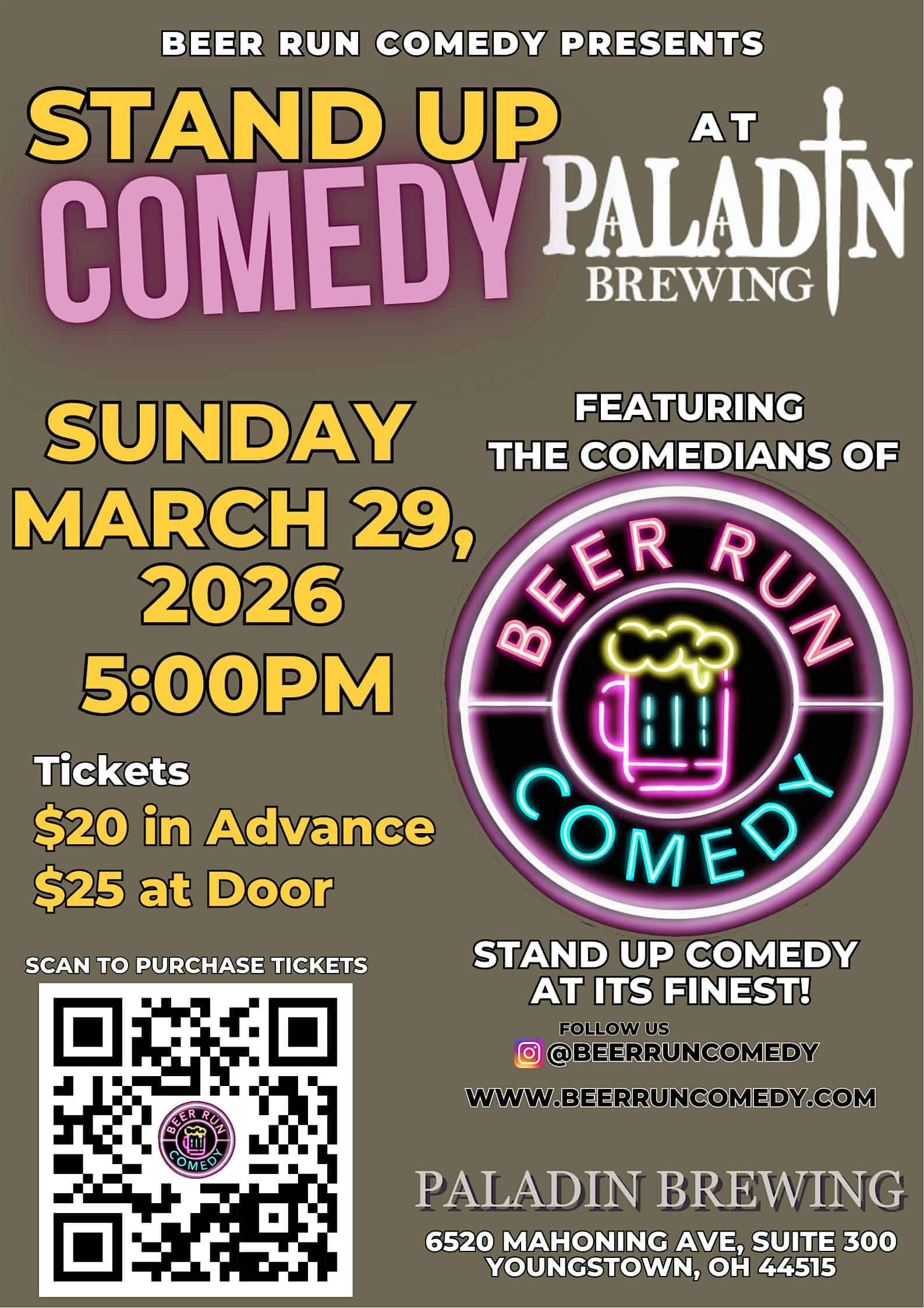 by admin14Feb Stand Up Comedy Night at Paladin Brewing at Paladin Brewing – Youngstown, OH Stand Up Comedy Night at Paladin Brewing at Paladin Brewing – Youngstown, OH 1 1 people viewed this event. The Beer Run Comedy crew is coming to Austintown, OH!!!!!! Tickets-RSVP Link Date And Time Sunday, March 29th, 2026 09:00 PM (PST) Venue Paladin Brewing Location 6520 Mahoning Avenue, Youngstown, OH 44515 Event Types Concert or PerformancePerforming & Visual Arts Event Category Ohio Share With Friends Facebook Twitter Linkedin Xing Pinterest Share This Post: