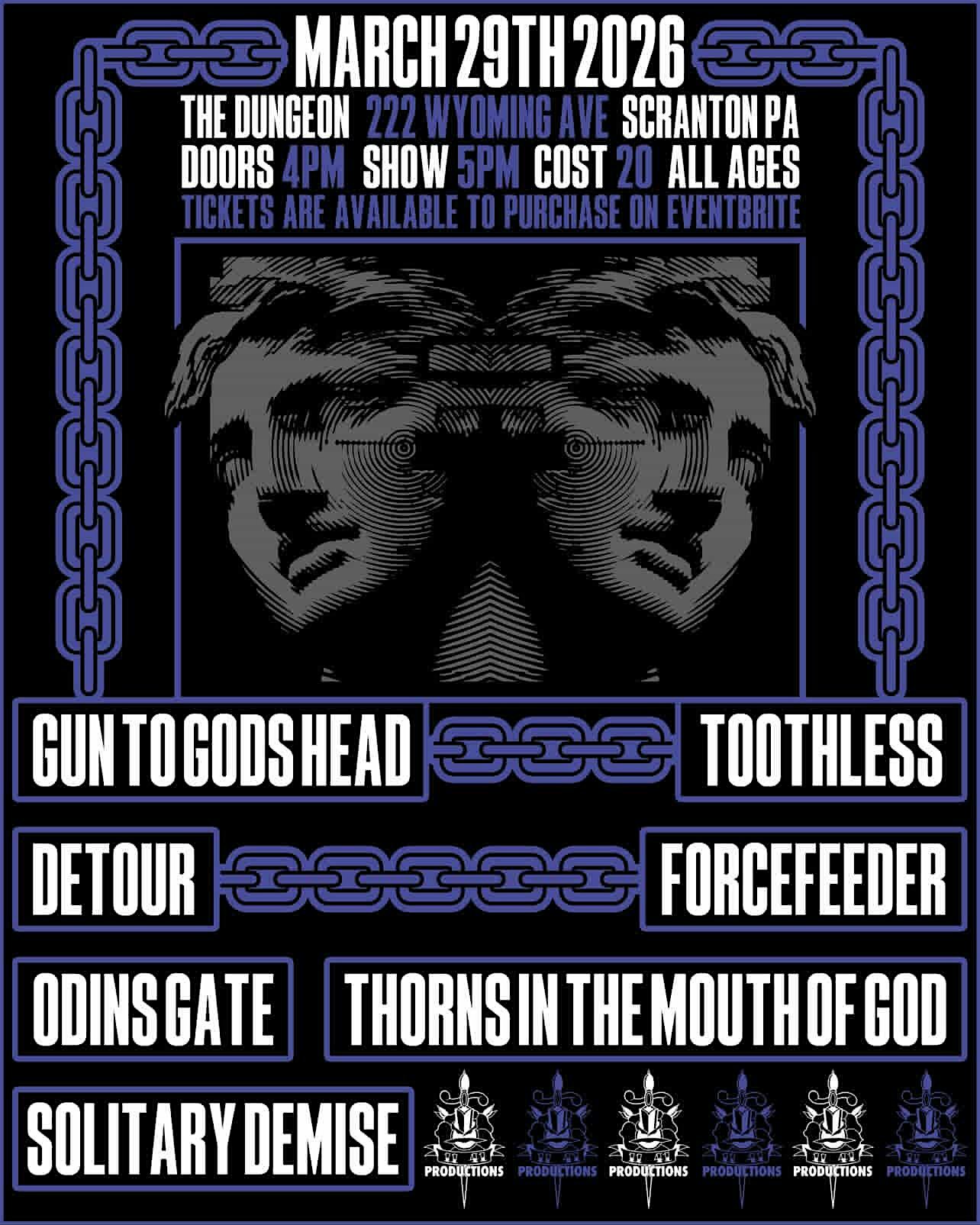 by admin24Feb Sunday Matinee at 222 Wyoming Ave – Scranton, PA Sunday Matinee at 222 Wyoming Ave – Scranton, PA 2 2 people viewed this event. Sunday Matinee! Gun to Gods Head, Toothless, Detour, ForceFeeder, Odins Gate, Thorns in the Mouth of God, Solitary Demise Tickets-RSVP Link Date And Time Sunday, March 29th, 2026 04:00 PM (PST) Venue 222 Wyoming Ave Location 222 Wyoming Avenue, Scranton, PA 18503 Event Types Concert or PerformanceMusic Event Category Pennsylvania Share With Friends Facebook Twitter Linkedin Xing Pinterest Share This Post: