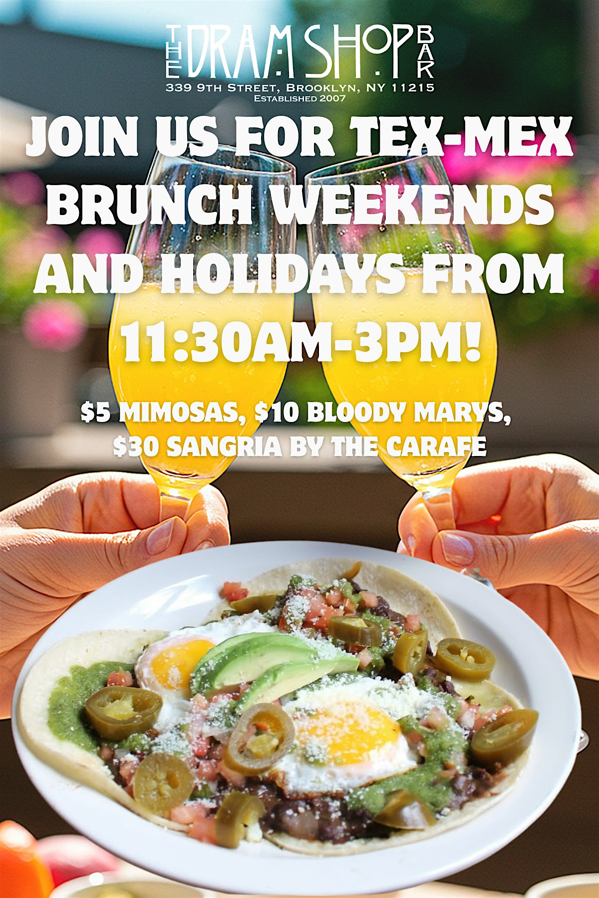 by admin27Feb Tex-Mex Brunch at The Dram Shop Bar – Brooklyn, NY Tex-Mex Brunch at The Dram Shop Bar – Brooklyn, NY 2 2 people viewed this event. Enjoy a delicious Tex-Mex Brunch paired with $5 Mimosas, $10 bloody marys and $25 carafes of sangria. Tickets-RSVP Link Date And Time Sunday, March 29th, 2026 11:00 AM (PST) Venue The Dram Shop Bar Location 339 9th Street, Brooklyn, NY 11215 Event Types Food & DrinkParty or Social Gathering Event Category New York Share With Friends Facebook Twitter Linkedin Xing Pinterest Share This Post: