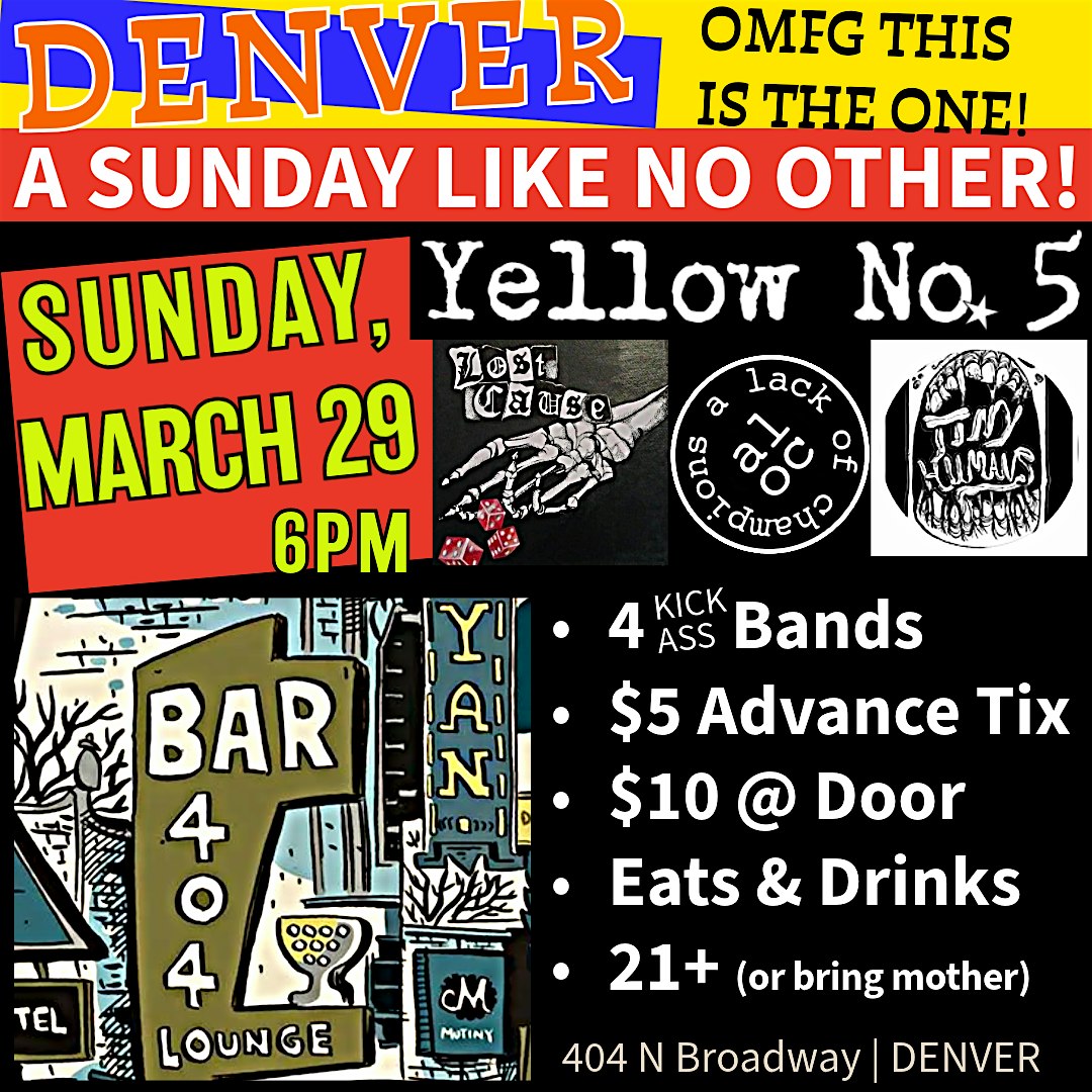 by admin24Feb Yellow No 5, Lost Cause, A Lack of Champions and Tiny Humans at Bar 404 – Denver, CO Yellow No 5, Lost Cause, A Lack of Champions and Tiny Humans at Bar 404 – Denver, CO 2 2 people viewed this event. Yellow No 5 on a US Tour and Headlining their stop in Denver at Bar404! Lost Cause, A Lack of Champions and Tiny Humans round the bill. Tickets-RSVP Link Date And Time Sunday, March 29th, 2026 06:00 PM (PST) Venue Bar 404 Location 404 Broadway, Denver, CO 80203 Event Types Concert or PerformanceMusic Event Category ColoradoDenver Share With Friends Facebook Twitter Linkedin Xing Pinterest Share This Post: