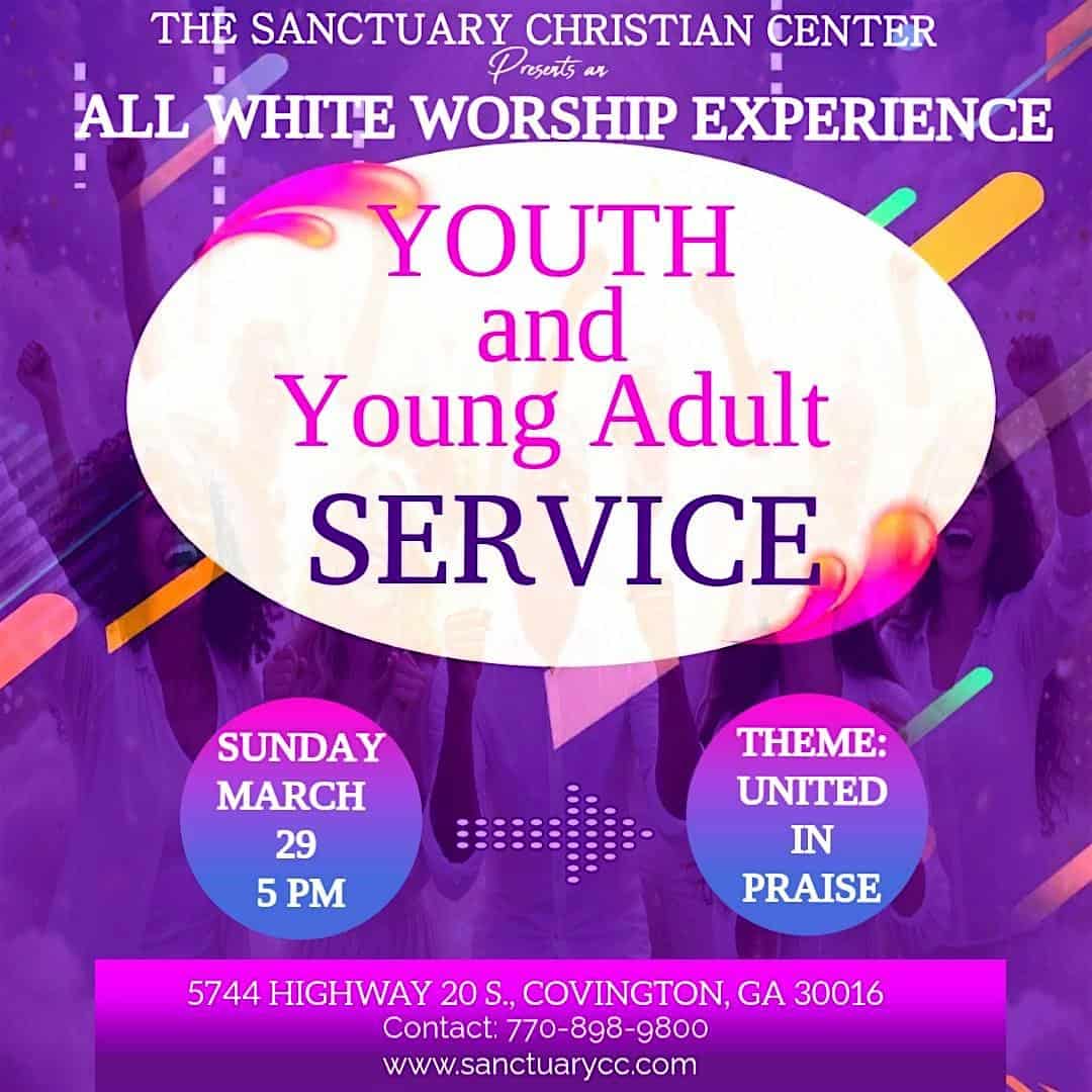 by admin14Feb Young Adults All White Worship Experience at The Sanctuary Christian Center – Covington, GA Young Adults All White Worship Experience at The Sanctuary Christian Center – Covington, GA 1 1 people viewed this event. Join us for the Young Adults All White Worship Experience – a night of worship, unity, and great ambience! Tickets-RSVP Link Date And Time Sunday, March 29th, 2026 09:00 PM (PST) Venue The Sanctuary Christian Center Location 5744 Hwy 20. S, Covington, GA 30016 Event Types Party or Social Gathering Event Category Georgia Share With Friends Facebook Twitter Linkedin Xing Pinterest Share This Post: