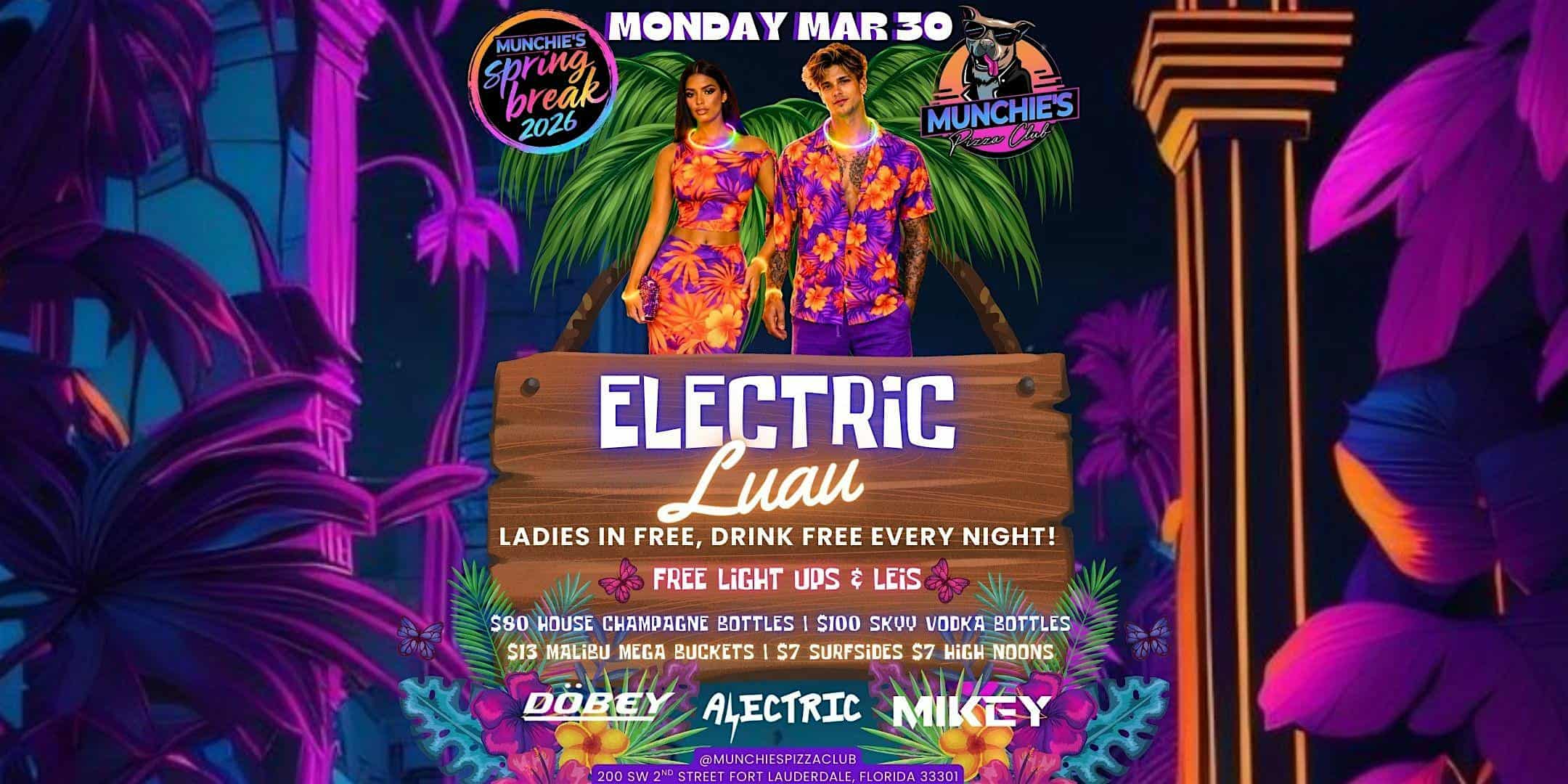 by admin23Feb 3/30- ELECTRIC LUAU – SPRING BREAK 2026 @ MUNCHIE’S at Munchie’s Pizza Club – Fort Lauderdale, FL 3/30- ELECTRIC LUAU – SPRING BREAK 2026 @ MUNCHIE’S at Munchie’s Pizza Club – Fort Lauderdale, FL 2 2 people viewed this event. The ultimate Spring Break destination in downtown Fort Lauderdale! Tickets-RSVP Link Date And Time Monday, March 30th, 2026 09:00 PM (PST) Venue Munchie's Pizza Club Location 200 Southwest 2nd Street, Fort Lauderdale, FL 33301 Event Types MusicParty or Social Gathering Event Category FloridaFt Lauderdale Share With Friends Facebook Twitter Linkedin Xing Pinterest Share This Post: