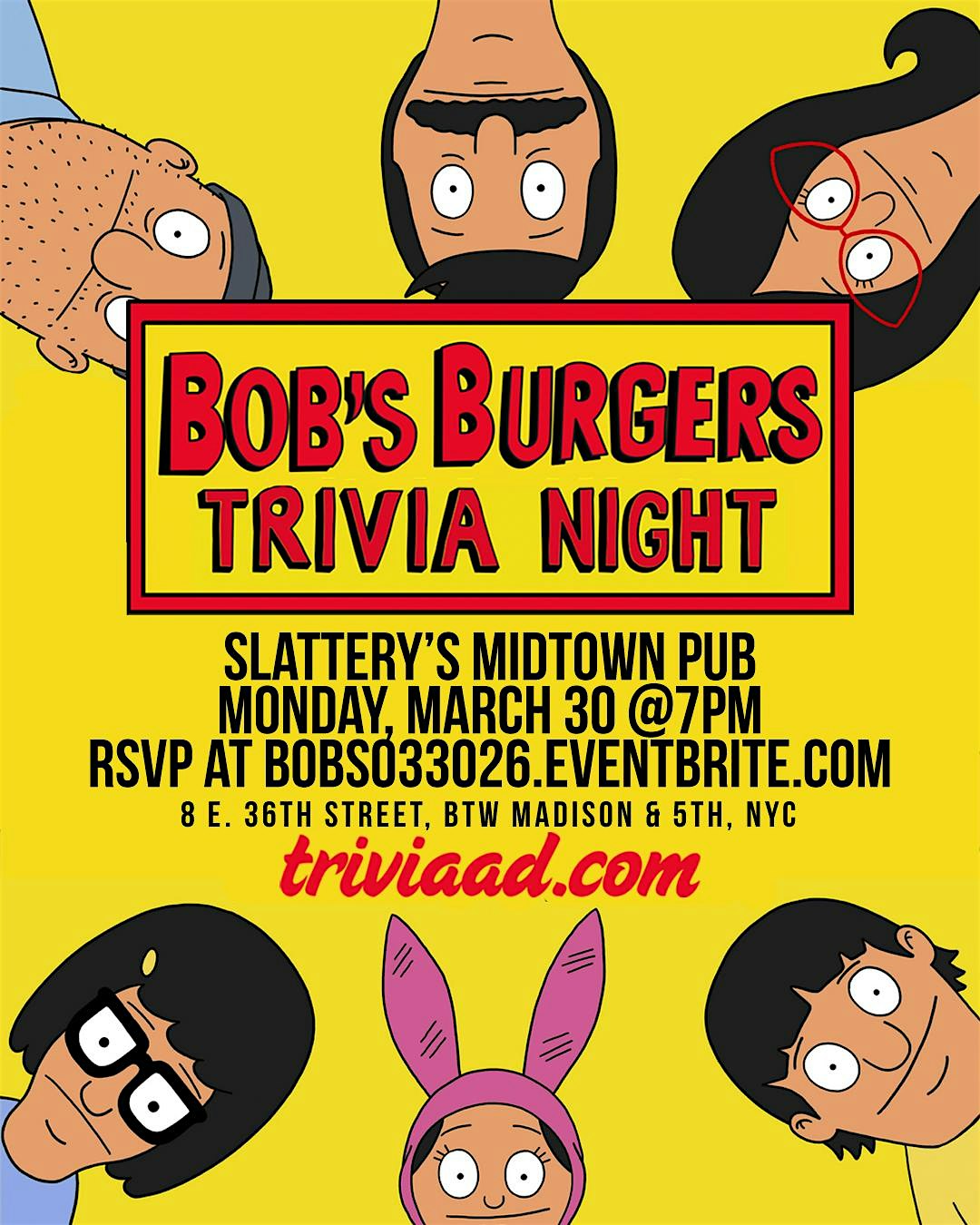 by admin27Feb Bob’s Burgers Trivia at Slattery’s Midtown Pub – New York, NY Bob’s Burgers Trivia at Slattery’s Midtown Pub – New York, NY 1 1 people viewed this event. “Hello and welcome to Bob’s Burgers. The burger of the day is the ‘child molester’—it comes with candy.” Tickets-RSVP Link Date And Time Monday, March 30th, 2026 07:00 PM (PST) Venue Slattery's Midtown Pub Location 8 East 36th Street, New York, NY 10016 Event Types Food & Drink Event Category New YorkNew York City Share With Friends Facebook Twitter Linkedin Xing Pinterest Share This Post: