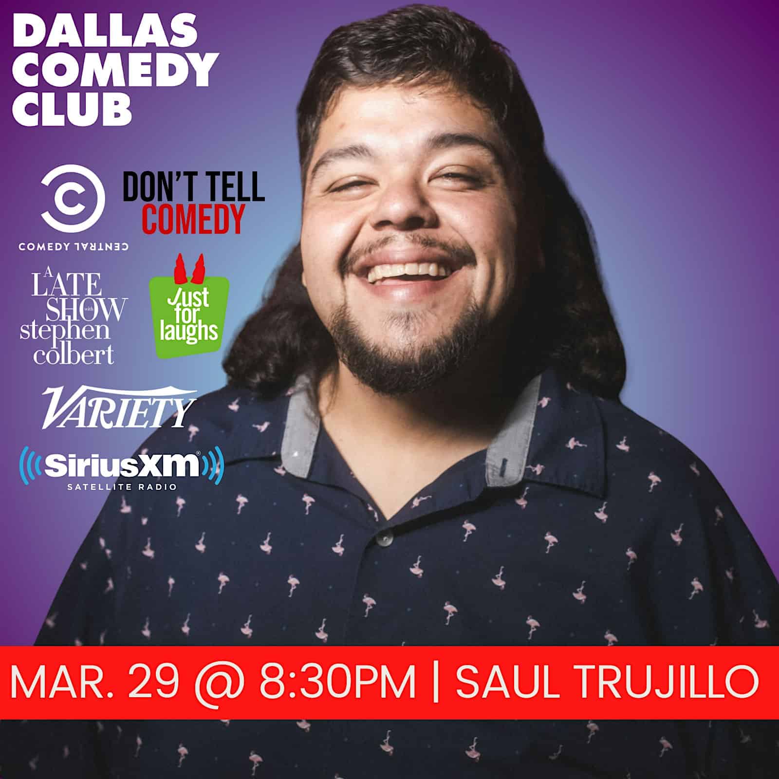 by admin14Feb Dallas Comedy Club Presents: SAUL TRUJILLO at Dallas Comedy Club – Dallas, TX Dallas Comedy Club Presents: SAUL TRUJILLO at Dallas Comedy Club – Dallas, TX 1 1 people viewed this event. You’ve seen him on Comedy Central, Don’t Tell Comedy & more! See Saul Trujillo at Dallas Comedy Club Mar. 29th at 8:30pm! Tickets-RSVP Link Date And Time Monday, March 30th, 2026 01:00 AM (PST) Venue Dallas Comedy Club Location 3036 Elm Street, Dallas, TX 75226 Event Types Concert or PerformancePerforming & Visual Arts Event Category DallasTexas Share With Friends Facebook Twitter Linkedin Xing Pinterest Share This Post: