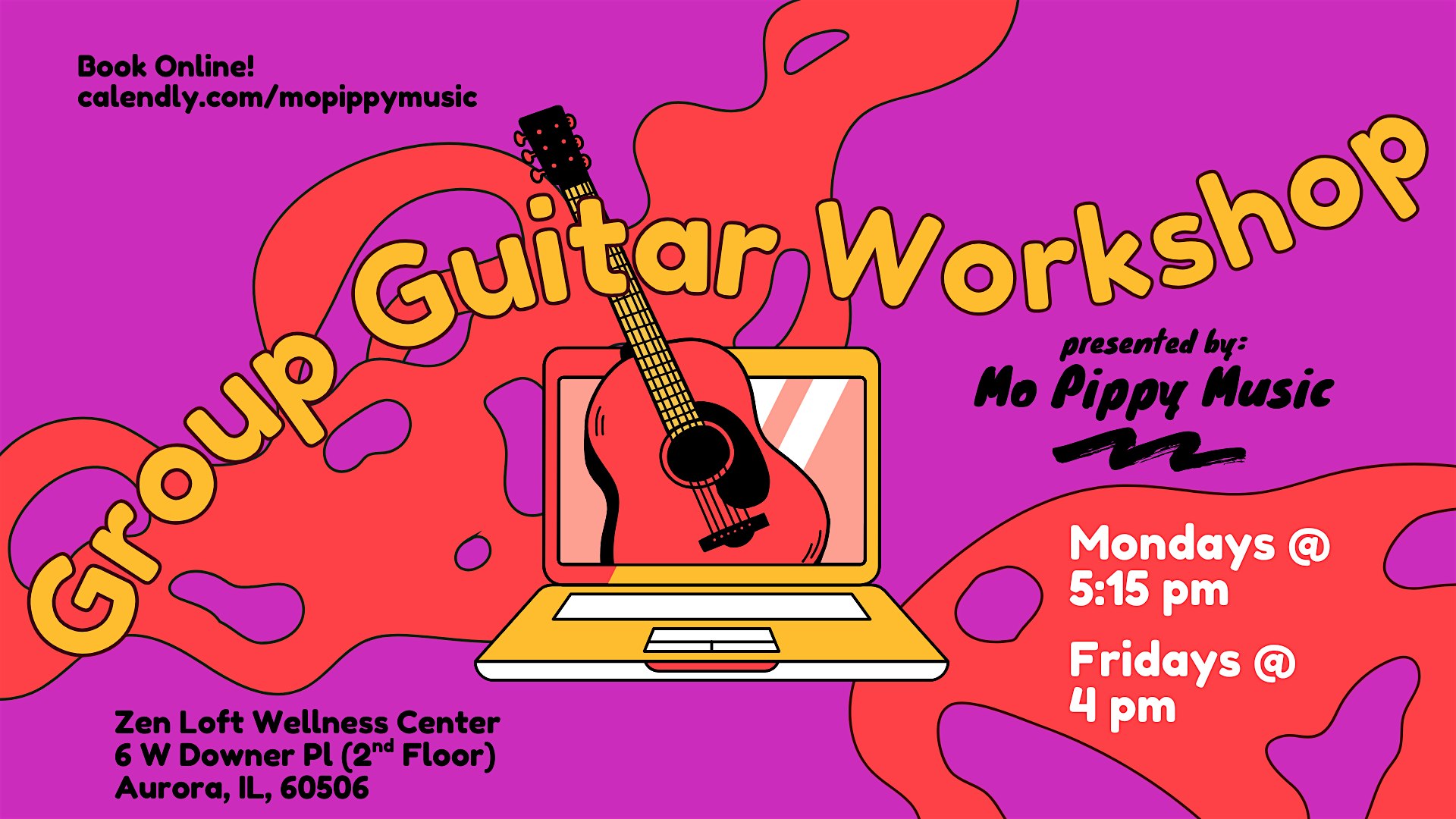 Group Guitar Workshop at Zen Loft Wellness Center – Aurora, IL Group Guitar Workshop at Zen Loft Wellness Center – Aurora, IL 2 2 people viewed this event. Join our beginner – intermediate group classes and learn to play in a supportive and social environment! Tickets-RSVP Link Register for event Date And Time Monday, March 30th, 2026 @ 05:00 PM Location 6 West Downer Place, Aurora, IL 60506 Event Types Class, Training, or WorkshopMusic Event Category Illinois Share With Friends Facebook Twitter Linkedin Xing Pinterest