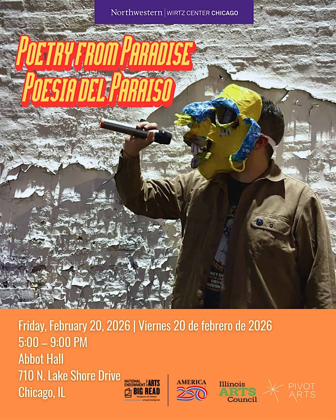 by admin23Feb Poetry from Paradise // Poesía del Paraíso at Abbott Hall – Chicago, IL Poetry from Paradise // Poesía del Paraíso at Abbott Hall – Chicago, IL 2 2 people viewed this event. Bilingual open mic exploring exile, climate change, and Andean & Amazonian mythologies. Bring a poem and share without borders. Tickets-RSVP Link Date And Time Monday, March 30th, 2026 10:00 AM (PST) Venue Abbott Hall Location 710 North Lake Shore Drive, Chicago, IL 60611 Event Types Party or Social GatheringPerforming & Visual Arts Event Category ChicagoIllinois Share With Friends Facebook Twitter Linkedin Xing Pinterest Share This Post: