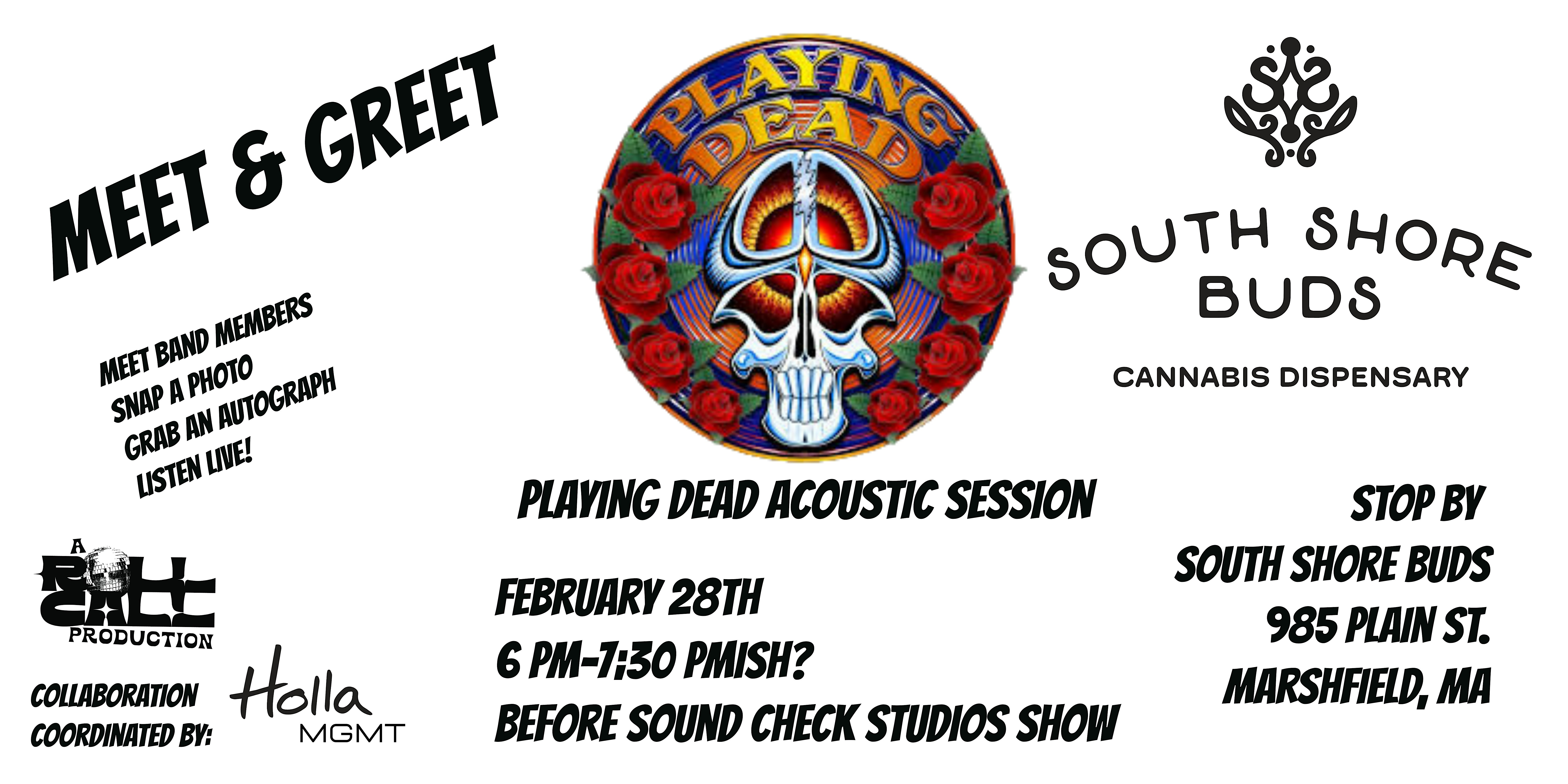 by admin27Feb South Shore Buds Roll Call Acoustic Session w/ Playing Dead | Meet & Greet at South Shore Buds Dispensary Marshfield – Marshfield, MA South Shore Buds Roll Call Acoustic Session w/ Playing Dead | Meet & Greet at South Shore Buds Dispensary Marshfield – Marshfield, MA 2 2 people viewed this event. Come join South Shore Buds and some of the members of Playing Dead for a pre-show Meet & Greet Acoustic Session. Tickets-RSVP Link Date And Time Monday, March 30th, 2026 @ 10:00 AM Location 985 Plain Street, Marshfield, MA 2050 Event Types Concert or PerformanceMusic Event Category Massachusetts Share With Friends Facebook Twitter Linkedin Xing Pinterest Share This Post: