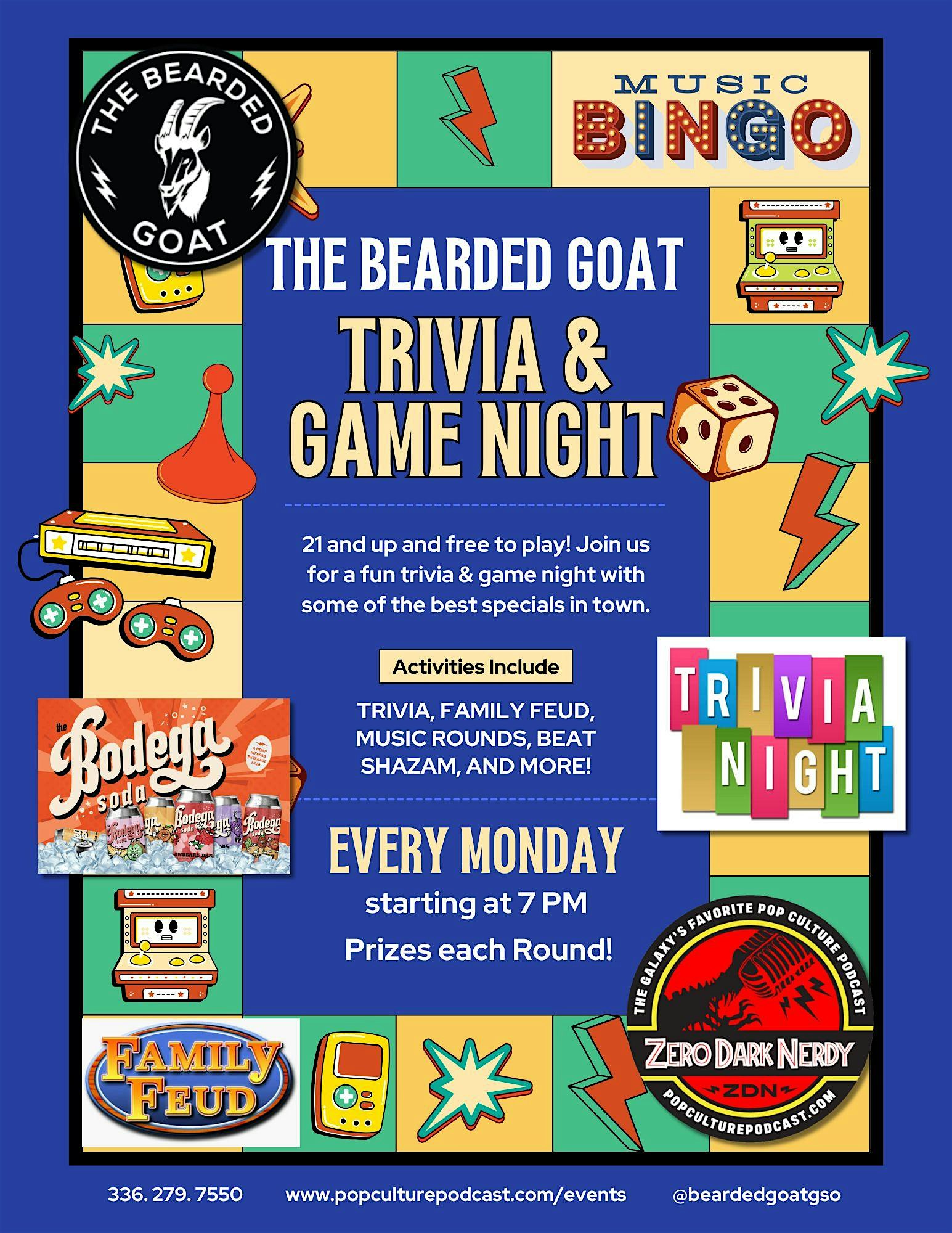 Trivia Night at The Bearded Goat with Zero Dark Nerdy at The Bearded Goat – Greensboro, NC Trivia Night at The Bearded Goat with Zero Dark Nerdy at The Bearded Goat – Greensboro, NC 2 2 people viewed this event. Join us for an epic night of laughs, friendly competition, and brain-teasing fun hosted by Zero Dark Nerdy. Prizes each round! Tickets-RSVP Link Register for event Date And Time Monday, March 30th, 2026 @ 07:00 PM Location 116 East Lewis Street, Greensboro, NC 27406 Event Types Party or Social Gathering Event Category GreensboroNorth Carolina Share With Friends Facebook Twitter Linkedin Xing Pinterest