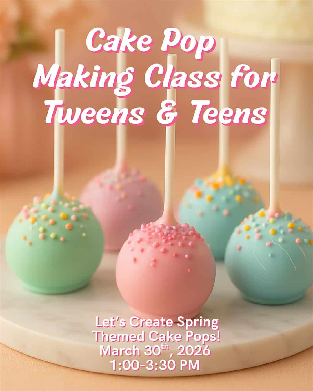 by admin14Feb Tweens & Teens Cake Pop Making Class at Fran’s Cake & Candy Supplies – Fairfax, VA Tweens & Teens Cake Pop Making Class at Fran’s Cake & Candy Supplies – Fairfax, VA 1 1 people viewed this event. Join us for this perfect class for tweens and teens where they will learn the art of making and decorating cake pops from start to finish Tickets-RSVP Link Date And Time Monday, March 30th, 2026 05:00 PM (PST) Venue Fran's Cake & Candy Supplies Location 10927 Main Street, Fairfax, VA 22030 Event Types Food & Drink Event Category Virginia Share With Friends Facebook Twitter Linkedin Xing Pinterest Share This Post: