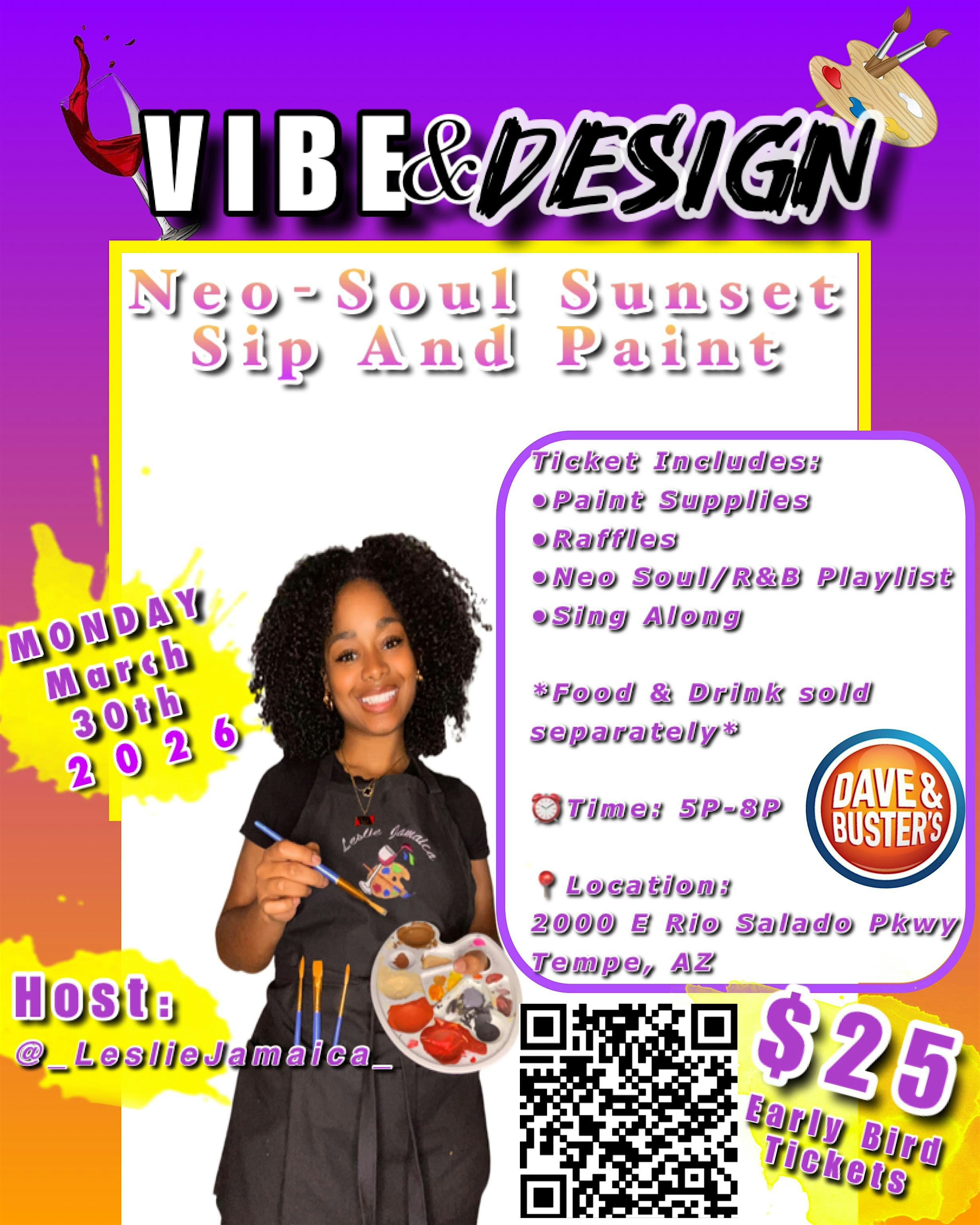 Vibe & Design – Sip and Paint at Dave & Buster’s Tempe – Tempe, AZ Vibe & Design – Sip and Paint at Dave & Buster’s Tempe – Tempe, AZ 2 2 people viewed this event. Vibe & Design is coming to Dave & Busters-Tempe! Sip, Paint & Sing to your favorite NeoSoul/R&B Hits w/ your Friends, your Bae, or Solo! Tickets-RSVP Link Register for event Date And Time Monday, March 30th, 2026 @ 05:00 PM Location 2000 East Rio Salado Parkway, Tempe, AZ 85281 Event Types Party or Social GatheringPerforming & Visual Arts Event Category ArizonaTempe Share With Friends Facebook Twitter Linkedin Xing Pinterest