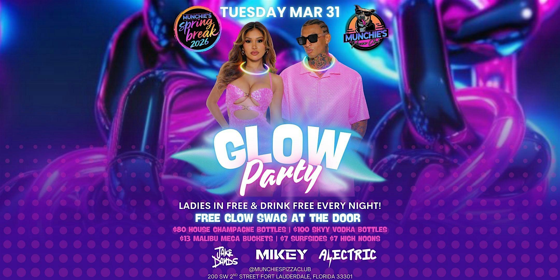 by admin22Feb 3/31- GLOW PARTY – SPRING BREAK 2026 @ MUNCHIE’S at Munchie’s Pizza Club – Fort Lauderdale, FL 3/31- GLOW PARTY – SPRING BREAK 2026 @ MUNCHIE’S at Munchie’s Pizza Club – Fort Lauderdale, FL 1 1 people viewed this event. The ultimate Spring Break destination in downtown Fort Lauderdale! Tickets-RSVP Link Date And Time Tuesday, March 31st, 2026 @ 09:00 PM Location 200 Southwest 2nd Street, Fort Lauderdale, FL 33301 Event Types MusicParty or Social GatheringSpring Break Event Category FloridaFt Lauderdale Share With Friends Facebook Twitter Linkedin Xing Pinterest Share This Post: