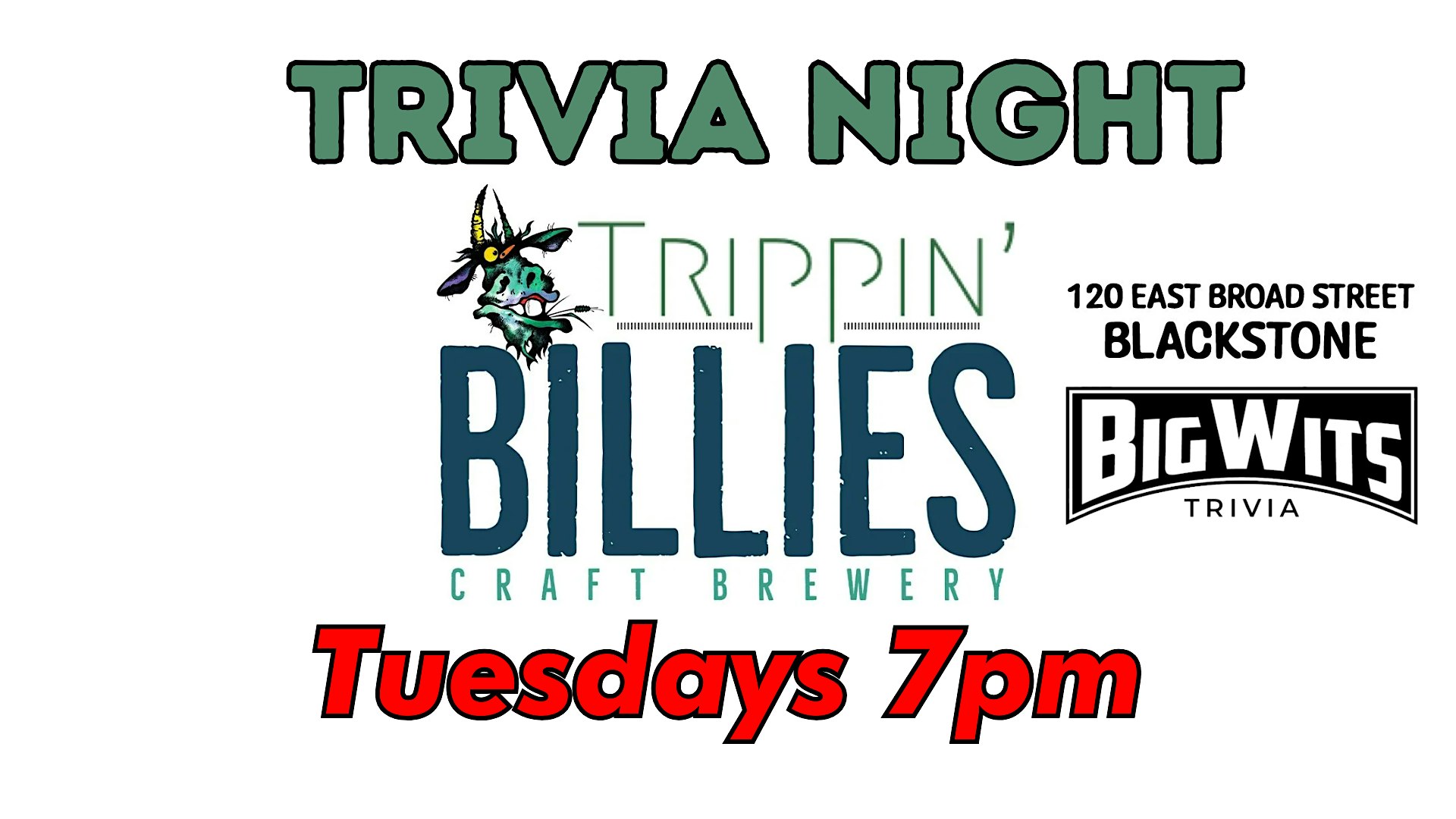 BigWits Trivia Tuesday at Trippin’ Billies Brewery at Trippin’ Billies Craft Brewery – Blackstone, VA BigWits Trivia Tuesday at Trippin’ Billies Brewery at Trippin’ Billies Craft Brewery – Blackstone, VA 2 2 people viewed this event. Tuesdays at Trippin’ Billies are BIG! Trivia starts at 7pm Tickets-RSVP Link Register for event Date And Time Tuesday, March 31st, 2026 @ 07:00 PM Location 120 East Broad Street, Blackstone, VA 23824 Event Types Food & DrinkGame or Competition Event Category Virginia Share With Friends Facebook Twitter Linkedin Xing Pinterest