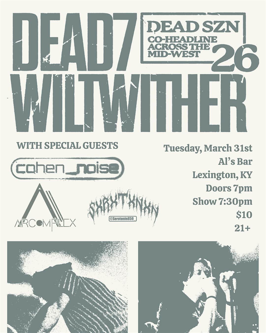 by admin14Feb dead7 and Wiltwither at Al’s Bar at Al’s Bar – Lexington, KY dead7 and Wiltwither at Al’s Bar at Al’s Bar – Lexington, KY 1 1 people viewed this event. dead7 and Wiltwither stop at Al’s Bar on their ‘DEAD SZN’ midwest trek featuring special guests cohen_noise, Arcomplex, and Serotnoin859! Tickets-RSVP Link Date And Time Tuesday, March 31st, 2026 11:00 PM (PST) Venue Al's Bar Location 601 North Limestone, Lexington, KY 40508 Event Types Concert or PerformancePerforming & Visual Arts Event Category Kentucky Share With Friends Facebook Twitter Linkedin Xing Pinterest Share This Post: