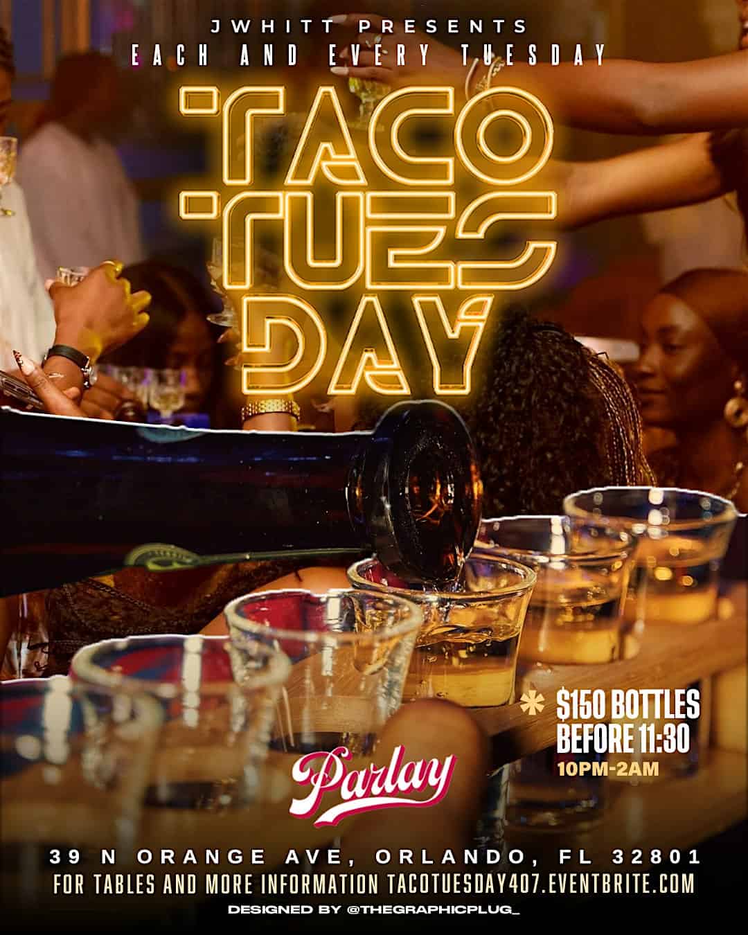 by admin23Feb Taco Tuesday at Parlay at Parlay Orlando – Orlando, FL Taco Tuesday at Parlay at Parlay Orlando – Orlando, FL 2 2 people viewed this event. Taco Tuesday #1 Party in Downtown Orlando Tickets-RSVP Link Date And Time Tuesday, March 31st, 2026 10:00 PM (PST) Venue Parlay Orlando Location 39 North Orange Avenue, Orlando, FL 32801 Event Types MusicParty or Social Gathering Event Category FloridaOrlando Share With Friends Facebook Twitter Linkedin Xing Pinterest Share This Post: