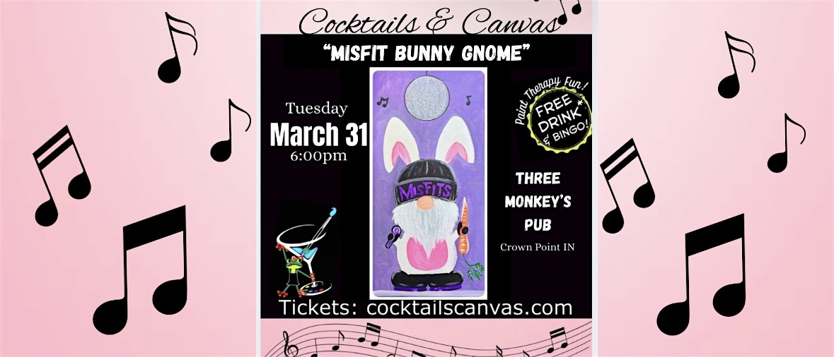 “The MiSfIt Bunny Gnome” Cocktails & Canvas Paint & Sip w/*FREE Drink! at Three Monkeys Pub, Adams Street, Crown Point, IN, USA – Crown Point, IN