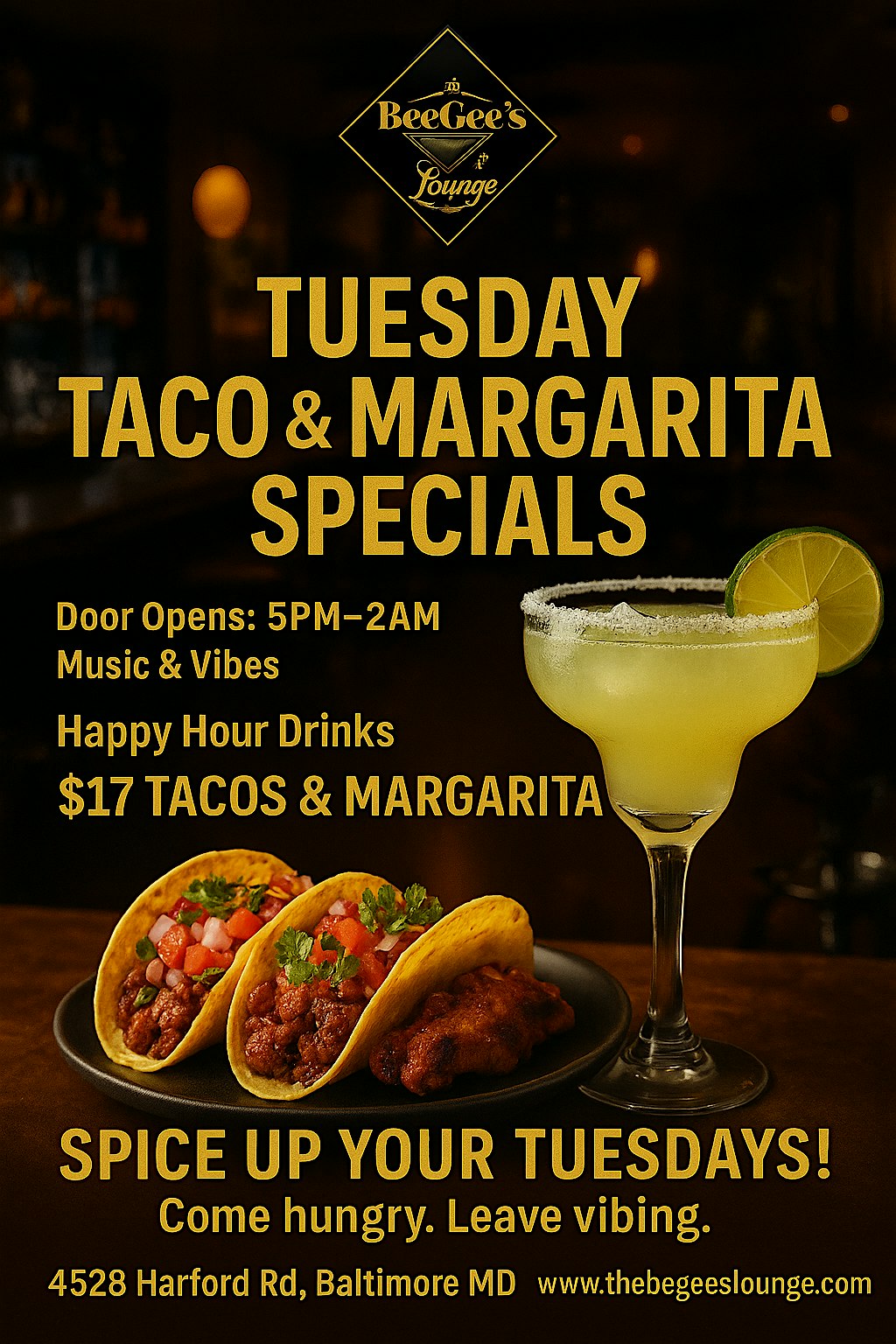 Tuesday Tacos With Margaritas @ $17 at 4528 Harford Rd – Baltimore, MD Tuesday Tacos With Margaritas @ $17 at 4528 Harford Rd – Baltimore, MD 2 2 people viewed this event. Join us for a fiesta of tasty tacos and margaritas – only $17 for a delicious Tuesday treat! Tickets-RSVP Link Register for event Date And Time Tuesday, March 31st, 2026 @ 05:00 PM Location 4528 Harford Road, Baltimore, MD 21214 Event Types Dinner or GalaFood & Drink Event Category BaltimoreMaryland Share With Friends Facebook Twitter Linkedin Xing Pinterest