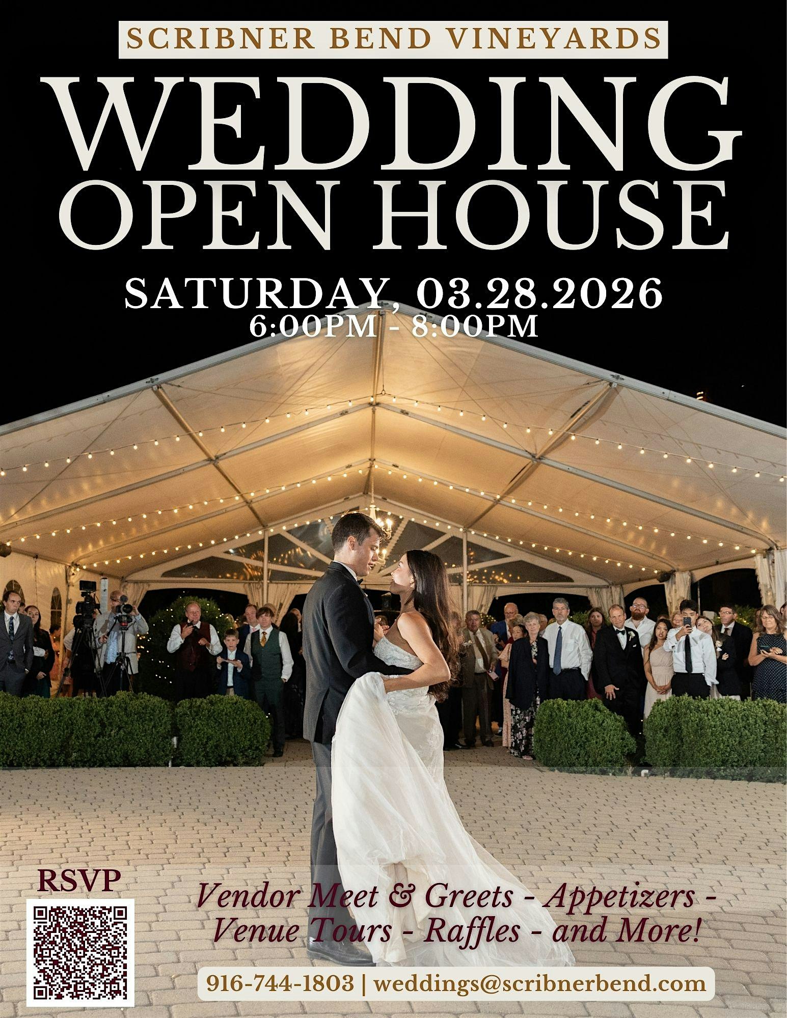 by admin27Feb Wedding Open House at Scribner Bend Vineyards – Sacramento, CA Wedding Open House at Scribner Bend Vineyards – Sacramento, CA 1 1 people viewed this event. ✨ Evening Wedding Open House | Saturday, March 28 | 6–8 PM ✨ Experience our wedding venue after hours and !! Tickets-RSVP Link Date And Time Tuesday, March 31st, 2026 06:00 PM (PST) Venue Scribner Bend Vineyards Location 9051 River Rd, Sacramento, CA 95832 Event Types Party or Social Gathering Event Category CaliforniaSacramento Share With Friends Facebook Twitter Linkedin Xing Pinterest Share This Post: