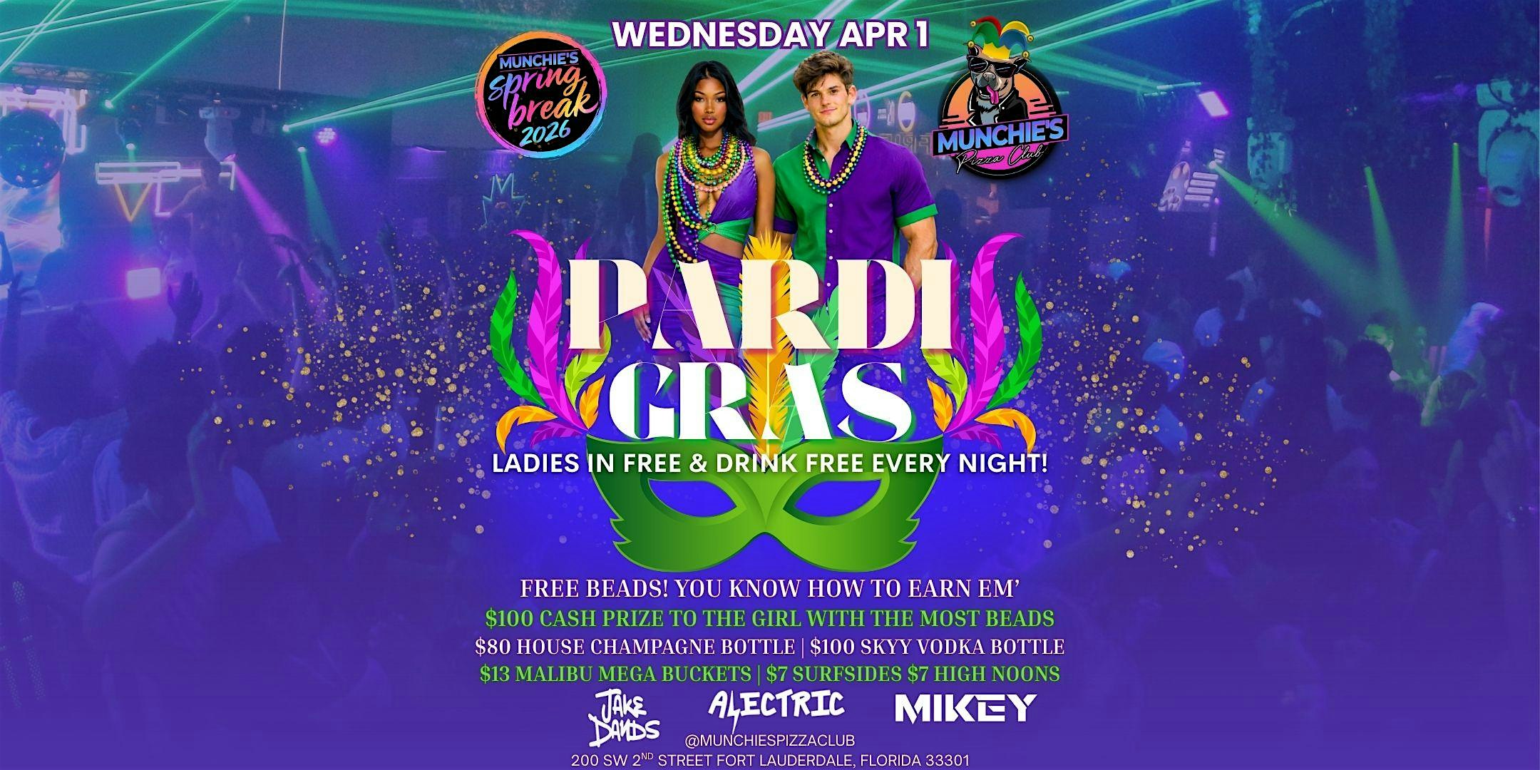 by admin22Feb 4/01- PARDI GRAS – SPRING BREAK 2026 @ MUNCHIE’S at Munchie’s Pizza Club – Fort Lauderdale, FL 4/01- PARDI GRAS – SPRING BREAK 2026 @ MUNCHIE’S at Munchie’s Pizza Club – Fort Lauderdale, FL 1 1 people viewed this event. The ultimate Spring Break destination in downtown Fort Lauderdale! Tickets-RSVP Link Date And Time Wednesday, April 1st, 2026 @ 09:00 PM Location 200 Southwest 2nd Street, Fort Lauderdale, FL 33301 Event Types MusicParty or Social GatheringSpring Break Event Category FloridaFt Lauderdale Share With Friends Facebook Twitter Linkedin Xing Pinterest Share This Post: