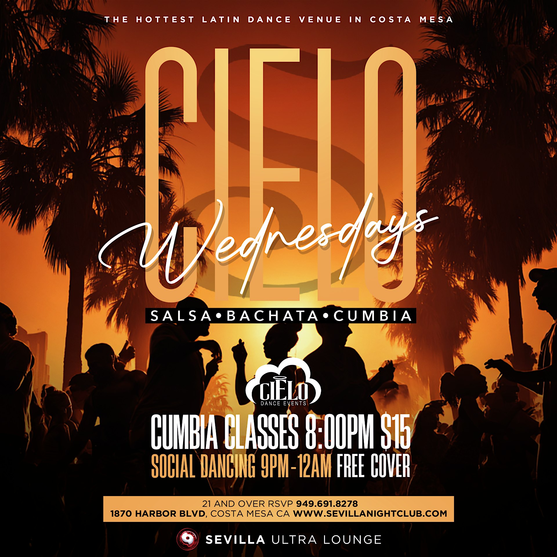 Costa Mesa: Wednesday Salsa Bachata Nights | Classes+After Party at Sevilla Nightclub of Costa Mesa – Costa Mesa, CA Costa Mesa: Wednesday Salsa Bachata Nights | Classes+After Party at Sevilla Nightclub of Costa Mesa – Costa Mesa, CA 3 3 people viewed this event. Salsa, Bachata & Cumbia Music All Night Long. Come for the class, stay for the vibes No dress code or RSVP needed. Free Safe Parking. Tickets-RSVP Link Register for event Date And Time Wednesday, April 1st, 2026 @ 09:00 PM Location 1870 Harbor Boulevard, Costa Mesa, CA 92627 Event Types MusicParty or Social Gathering Event Category CaliforniaIrvine Share With Friends Facebook Twitter Linkedin Xing Pinterest