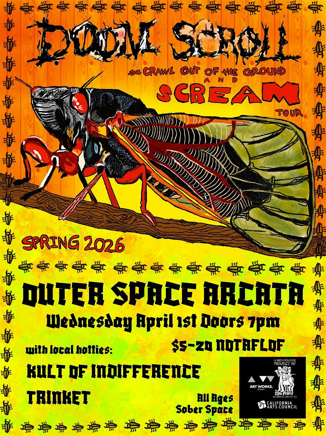 by admin24Feb Doom Scroll Live at Outer Space Arcata – April 1st, 2026 at Outer Space Arcata – Arcata, CA Doom Scroll Live at Outer Space Arcata – April 1st, 2026 at Outer Space Arcata – Arcata, CA 1 1 people viewed this event. Denver’s folk punk band Doom Scroll live at Outer Space Arcata with local surf punk trio Kult of Indifference & fold punk act Trinket 4/1/26 Tickets-RSVP Link Date And Time Wednesday, April 1st, 2026 07:00 PM (PST) Venue Outer Space Arcata Location 837 H Street, Arcata, CA 95521 Event Types Concert or PerformanceMusic Event Category California Share With Friends Facebook Twitter Linkedin Xing Pinterest Share This Post: