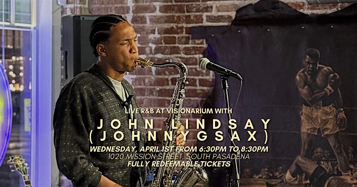 by admin27Feb Live R&B at Visionarium with John Lindsay (Johnnygsax) at 1020 Mission St – South Pasadena, CA Live R&B at Visionarium with John Lindsay (Johnnygsax) at 1020 Mission St – South Pasadena, CA 1 1 people viewed this event. John Lindsay, known as Johnnygsax, is bringing his signature R&B sax vibes for an evening filled with rhythm, energy, and pure atmosphere! Tickets-RSVP Link Date And Time Wednesday, April 1st, 2026 06:00 PM (PST) Venue 1020 Mission St Location 1020 Mission Street, South Pasadena, CA 91030 Event Types Concert or PerformanceMusic Event Category CaliforniaLos Angeles Share With Friends Facebook Twitter Linkedin Xing Pinterest Share This Post: