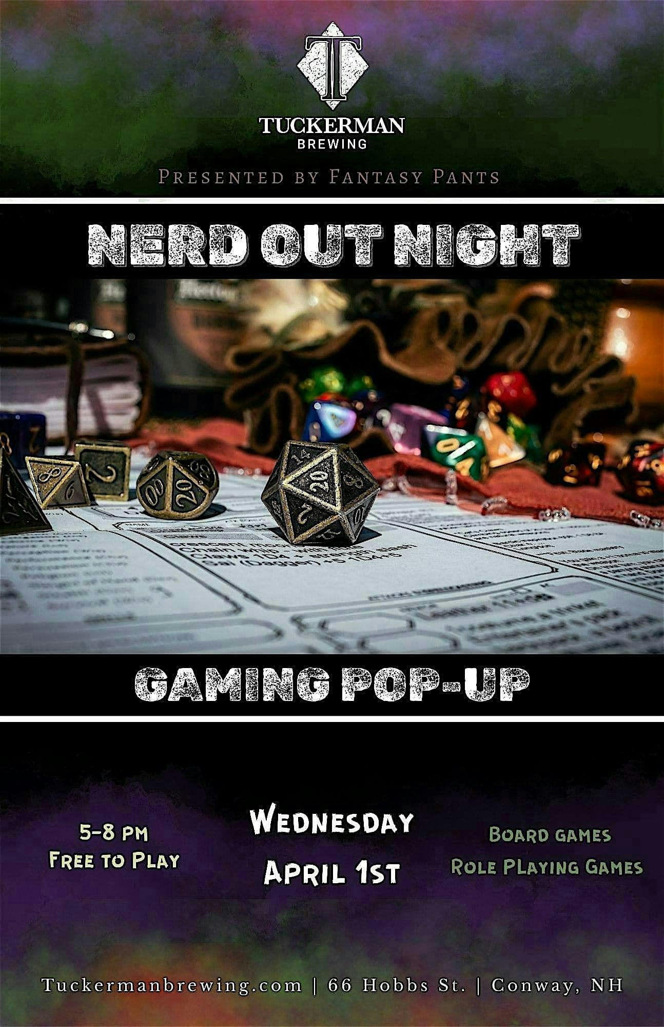 by admin23Feb Nerd Out Night at Tuckerman Brewing Company at Tuckerman Brewing – Conway, NH Nerd Out Night at Tuckerman Brewing Company at Tuckerman Brewing – Conway, NH 2 2 people viewed this event. Board games, roleplaying games, trading card games, and more! Sign up for a hosted game or bring your own to this gaming pop-up event. Tickets-RSVP Link Date And Time Wednesday, April 1st, 2026 05:00 PM (PST) Venue Tuckerman Brewing Location 66 Hobbs Street, Conway, NH 3818 Event Types Party or Social Gathering Event Category New Hampshire Share With Friends Facebook Twitter Linkedin Xing Pinterest Share This Post: