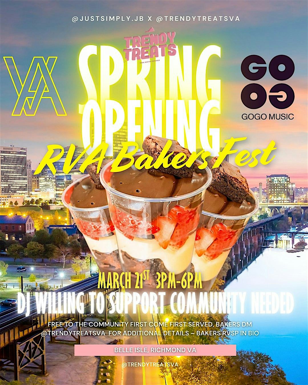 RVA Bakers Fest – Small Business Tasting at Belle Isle – Richmond, VA RVA Bakers Fest – Small Business Tasting at Belle Isle – Richmond, VA 1 1 people viewed this event. *DATE PENDING* Postponed – Go-go music, RVA bakers showcasing talent, good weather & vibes. Come hang with us—everyone’s welcome! Tickets-RSVP Link Register for event Date And Time Wednesday, April 1st, 2026 @ 02:00 PM Location 300 Tredegar St, Richmond, VA 23219 Event Types Food & DrinkMeeting or Networking Event Event Category Virginia Share With Friends Facebook Twitter Linkedin Xing Pinterest