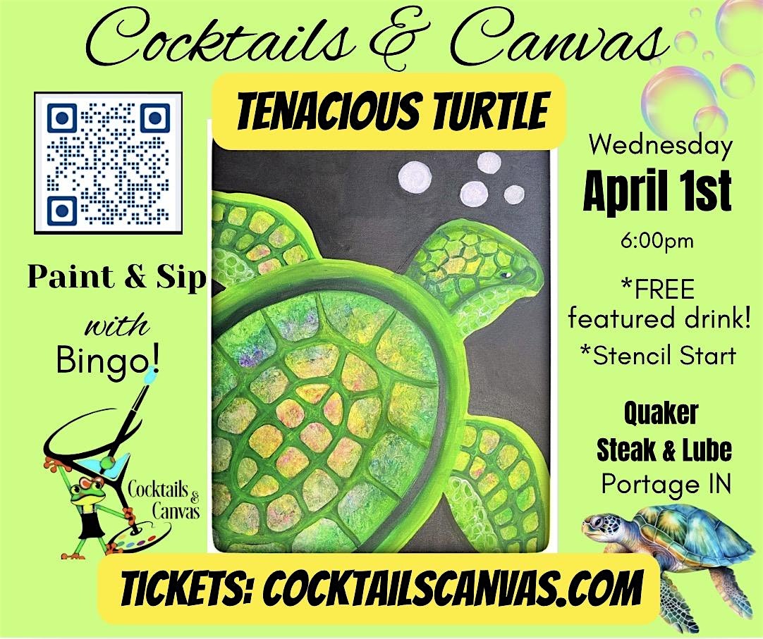 by admin13Feb The Tenacious Turtle Cocktails & Canvas Fun Paint and Sip Event at Quaker Steak & Lube – Portage, IN The Tenacious Turtle Cocktails & Canvas Fun Paint and Sip Event at Quaker Steak & Lube – Portage, IN 2 2 people viewed this event. Join us as we paint the totally tenacious turtle all together. A FREE featured drink, stencil start & few rounds of Bingo included too! Tickets-RSVP Link Date And Time Wednesday, April 1st, 2026 11:00 PM (PST) Venue Quaker Steak & Lube Location 6245 Ameriplex Drive, Portage, IN 46368 Event Types Party or Social GatheringPerforming & Visual Arts Event Category Indiana Share With Friends Facebook Twitter Linkedin Xing Pinterest Share This Post:
