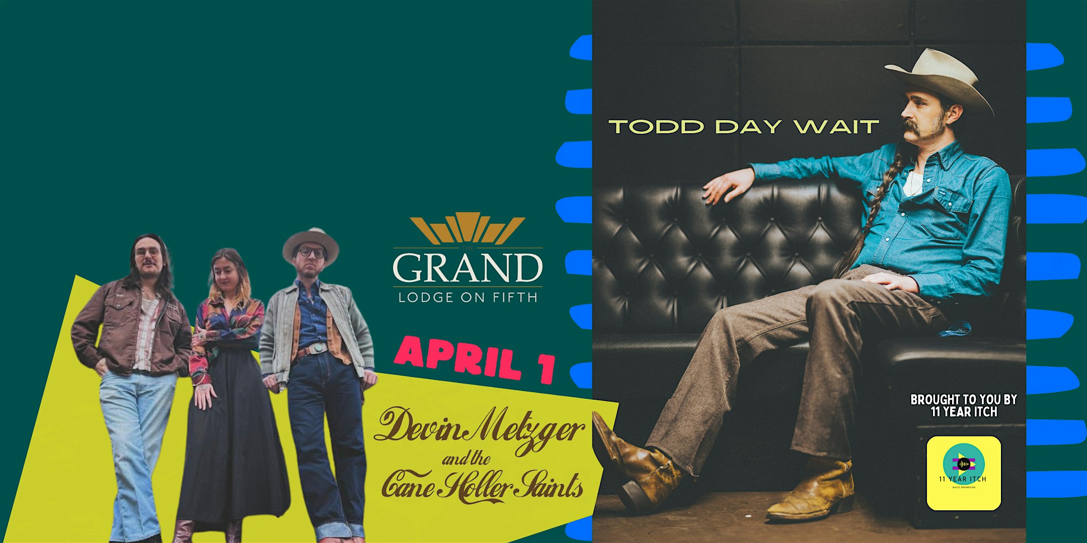 by admin24Feb Todd Day Wait w/ Devin Metzger and the Cane Holler Saints at The Grand Lodge – Paducah, KY Todd Day Wait w/ Devin Metzger and the Cane Holler Saints at The Grand Lodge – Paducah, KY 2 2 people viewed this event. A rowdy April Fool’s Day ready to be had by all!!! Tickets-RSVP Link Date And Time Wednesday, April 1st, 2026 07:00 PM (PST) Venue The Grand Lodge Location 121 North 5th Street, Paducah, KY 42001 Event Types Concert or PerformanceMusic Event Category Kentucky Share With Friends Facebook Twitter Linkedin Xing Pinterest Share This Post: