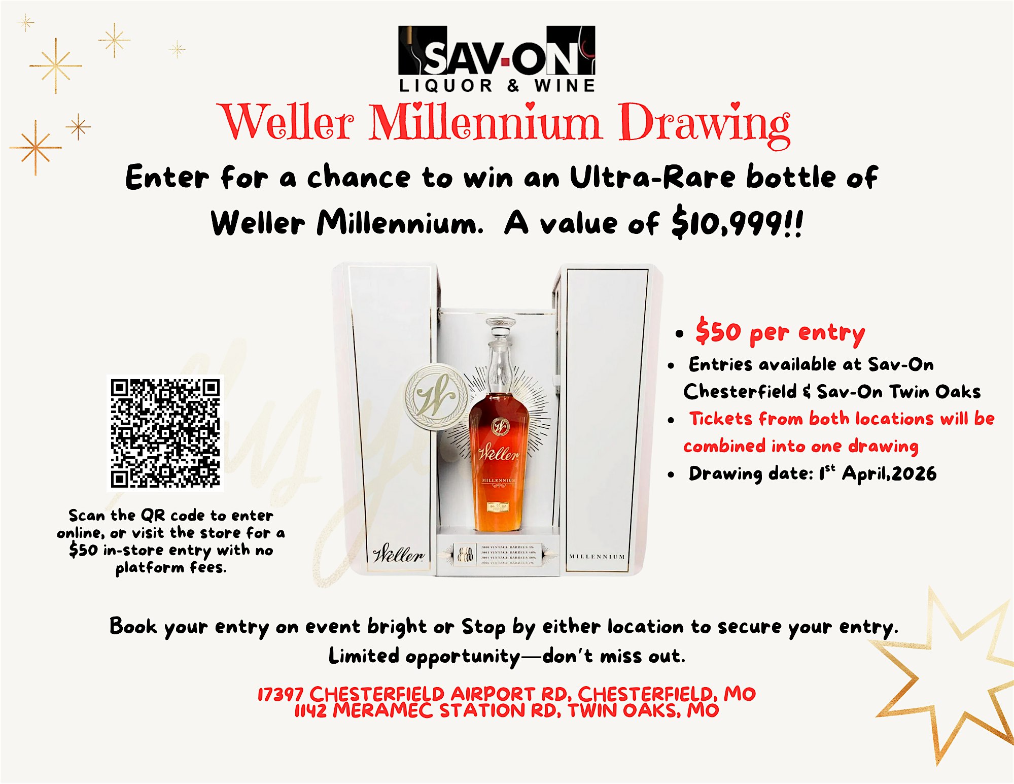 by admin13Feb Weller Millennium: Ultra-Rare Bourbon Raffle at 17397 Chesterfield Airport Rd – Chesterfield, MO Weller Millennium: Ultra-Rare Bourbon Raffle at 17397 Chesterfield Airport Rd – Chesterfield, MO 3 3 people viewed this event. Limited entries. One winner. Enter for a chance to win the ultra-rare Weller Millennium bourbon valued at $10,999. Tickets-RSVP Link Date And Time Wednesday, April 1st, 2026 05:00 PM (PST) Venue 17397 Chesterfield Airport Rd Location 17397 Chesterfield Airport Road, Chesterfield, MO 63005 Event Types OtherParty or Social Gathering Event Category Missouri Share With Friends Facebook Twitter Linkedin Xing Pinterest Share This Post: