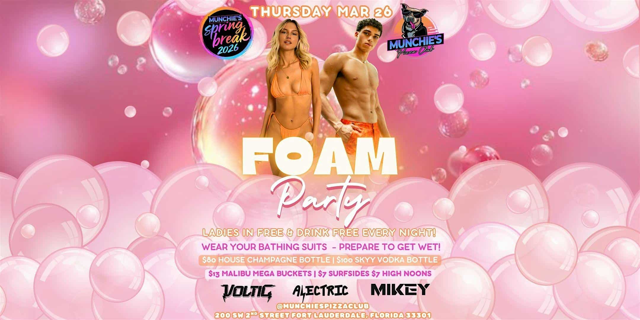 by admin23Feb 4/02- FOAM PARTY – SPRING BREAK 2026 @ MUNCHIE’S at Munchie’s Pizza Club – Fort Lauderdale, FL 4/02- FOAM PARTY – SPRING BREAK 2026 @ MUNCHIE’S at Munchie’s Pizza Club – Fort Lauderdale, FL 3 3 people viewed this event. The ultimate Spring Break destination in downtown Fort Lauderdale! Tickets-RSVP Link Date And Time Thursday, April 2nd, 2026 09:00 PM (PST) Venue Munchie's Pizza Club Location 200 Southwest 2nd Street, Fort Lauderdale, FL 33301 Event Types MusicParty or Social Gathering Event Category FloridaFt Lauderdale Share With Friends Facebook Twitter Linkedin Xing Pinterest Share This Post: