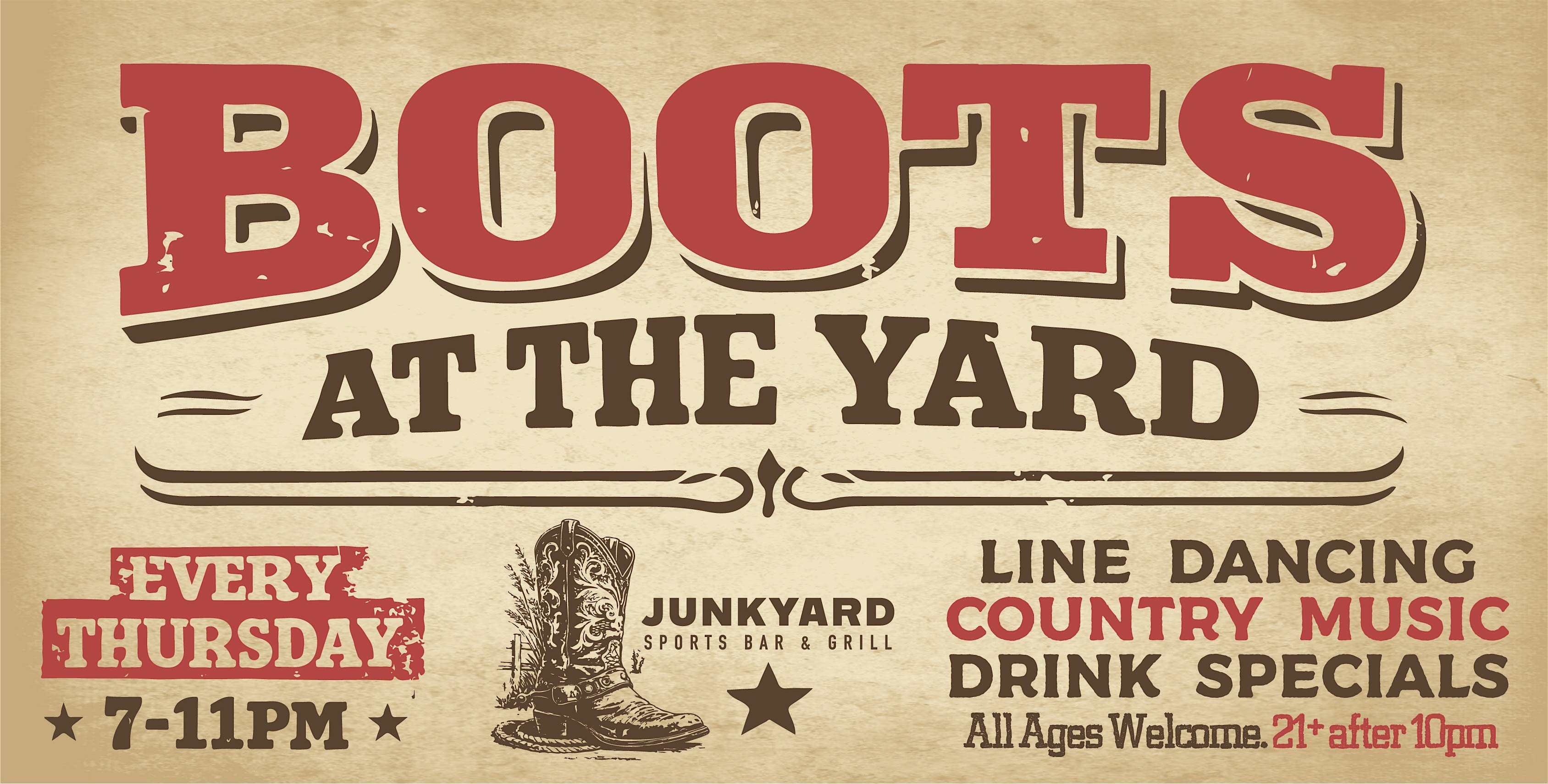 by admin24Feb Boots at the Yard at Junkyard Sports Bar & Grill – Oceanside, CA Boots at the Yard at Junkyard Sports Bar & Grill – Oceanside, CA 2 2 people viewed this event. Country Night at Junkyard Sports Bar & Grill featuring line dancing with an instructor and a country DJ playing all your Honky Tonk hits. Tickets-RSVP Link Date And Time Thursday, April 2nd, 2026 07:00 PM (PST) Venue Junkyard Sports Bar & Grill Location 3617 Ocean Ranch Boulevard, Oceanside, CA 92056 Event Types MusicParty or Social Gathering Event Category California Share With Friends Facebook Twitter Linkedin Xing Pinterest Share This Post: