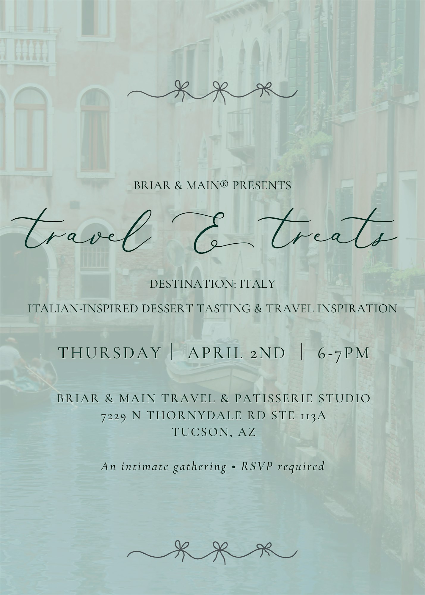 Guests will enjoy Italian-inspired desserts from Briar & Main The Patisserie while learning about thoughtfully designed itineraries, travel tips, and unique experiences for exploring Italy.