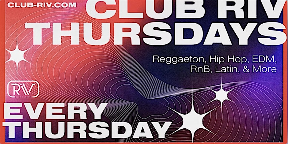 by admin27Feb Club Riv Thursdays at Club Riv – Riverside, CA Club Riv Thursdays at Club Riv – Riverside, CA 1 1 people viewed this event. Hip Hop, Rap, Reggaeton, R&B, and more Every Thursday in Riverside Tickets-RSVP Link Date And Time Thursday, April 2nd, 2026 09:00 PM (PST) Venue Club Riv Location 3557 University Avenue, Riverside, CA 92501 Event Types Food & DrinkParty or Social Gathering Event Category California Share With Friends Facebook Twitter Linkedin Xing Pinterest Share This Post: