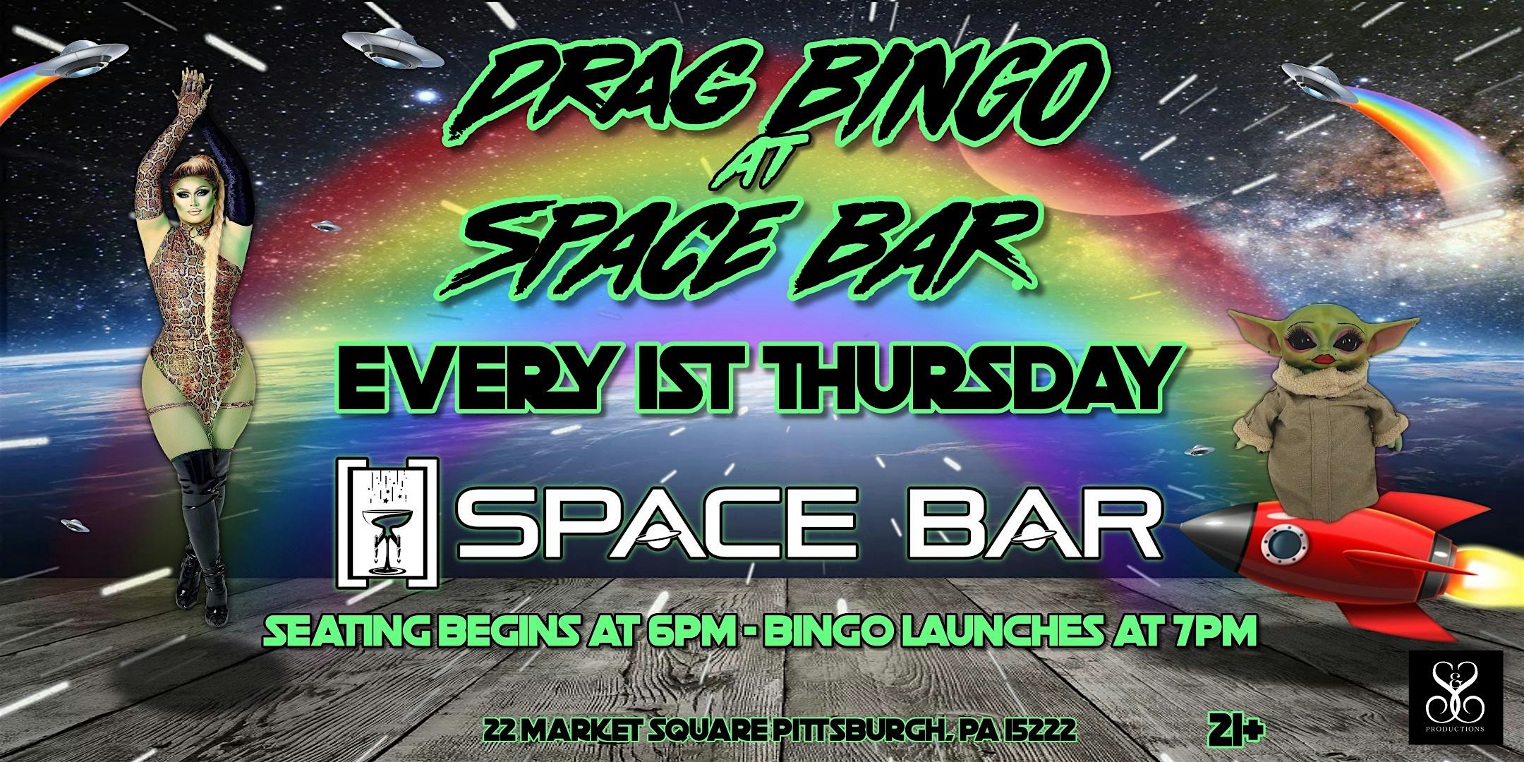 Get ready for an out-of-this-world experience at DRAG QUEENS IN OUTER SPACE DRAG BINGO / FIRST THURSDAYS / SPACE BAR MARKET SQUARE