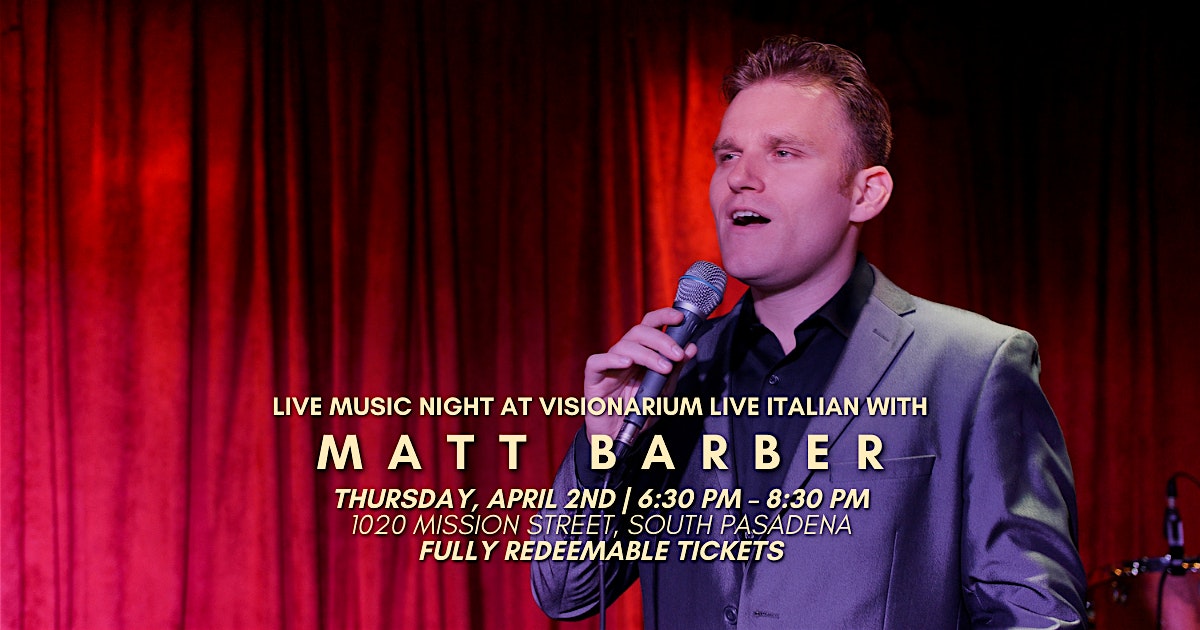 by admin24Feb Live Music Night at Visionarium Live Italian with Matt Barber at 1020 Mission St – South Pasadena, CA Live Music Night at Visionarium Live Italian with Matt Barber at 1020 Mission St – South Pasadena, CA 2 2 people viewed this event. Join us for an unforgettable evening of vocal jazz, pop, and timeless variety in the heart of South Pasadena! Tickets-RSVP Link Date And Time Thursday, April 2nd, 2026 06:00 PM (PST) Venue 1020 Mission St Location 1020 Mission Street, South Pasadena, CA 91030 Event Types Concert or PerformanceMusic Event Category CaliforniaLos Angeles Share With Friends Facebook Twitter Linkedin Xing Pinterest Share This Post: