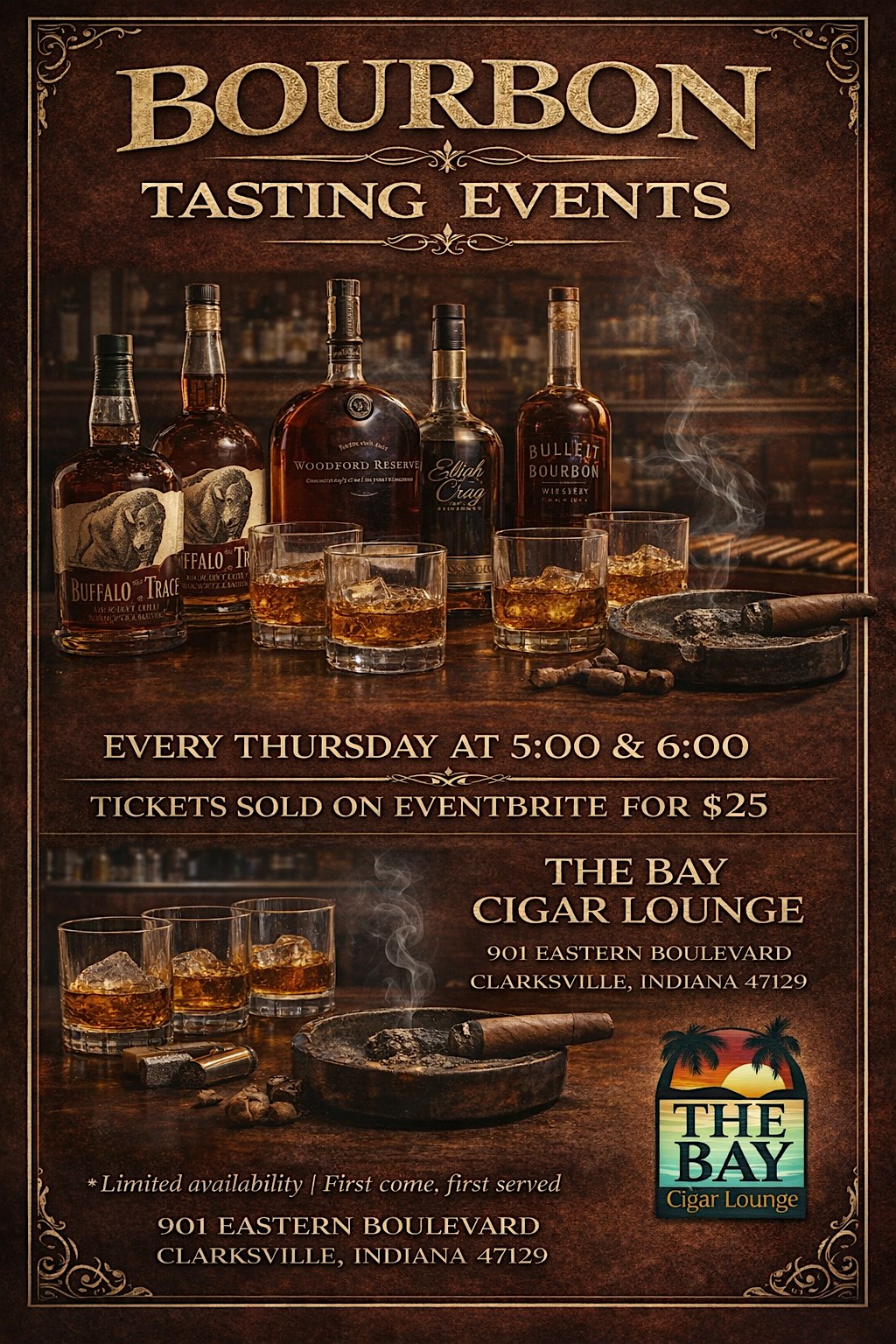 Tasting Bourbon At The Bay at The Bay Cigar Lounge LLC – Clarksville, IN Tasting Bourbon At The Bay at The Bay Cigar Lounge LLC – Clarksville, IN 1 1 people viewed this event. Weekly Bourbon Tasting Event. Sample fine bourbon from various makers. Tickets-RSVP Link Register for event Date And Time Thursday, April 2nd, 2026 @ 05:00 PM Location 901 Eastern Boulevard, Clarksville, IN 47129 Event Types Class, Training, or WorkshopFood & Drink Event Category Indiana Share With Friends Facebook Twitter Linkedin Xing Pinterest