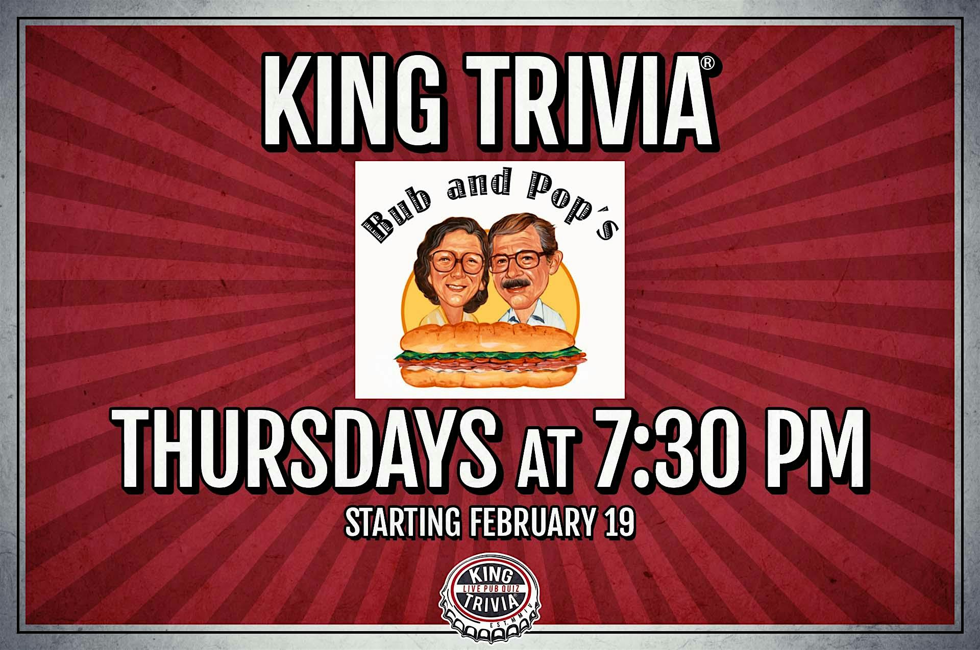 Trivia Night at Bub and Pop’s at Bub and Pop’s – Washington, DC Trivia Night at Bub and Pop’s at Bub and Pop’s – Washington, DC 1 1 people viewed this event. Your Weekly Bar Trivia Challenge! Drink a beer, munch some food, and compete for glory & prizes! FREE to play! Tickets-RSVP Link Register for event Date And Time Thursday, April 2nd, 2026 @ 07:00 PM Location 100 Florida Avenue Northeast, Washington, DC 20002 Event Types Food & DrinkGame or Competition Event Category Washington DC Share With Friends Facebook Twitter Linkedin Xing Pinterest
