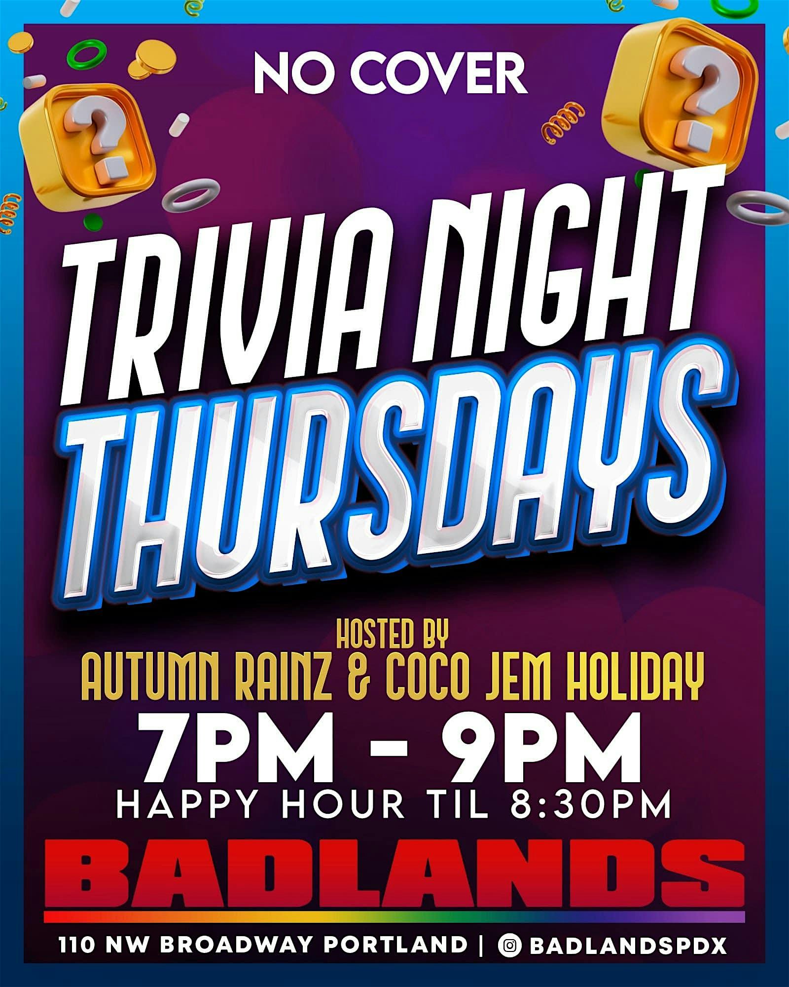 Trivia Night Thursdays @ Badlands at Badlands Portland – Portland, OR Trivia Night Thursdays @ Badlands at Badlands Portland – Portland, OR 1 1 people viewed this event. Trivia Thursdays @ Badlands Tickets-RSVP Link Register for event Date And Time Thursday, April 2nd, 2026 @ 07:00 PM Location 110 Northwest Broadway, Portland, ORĀ 97209 Event Types Food & DrinkGame or Competition Event Category OregonPortland Share With Friends Facebook Twitter Linkedin Xing Pinterest