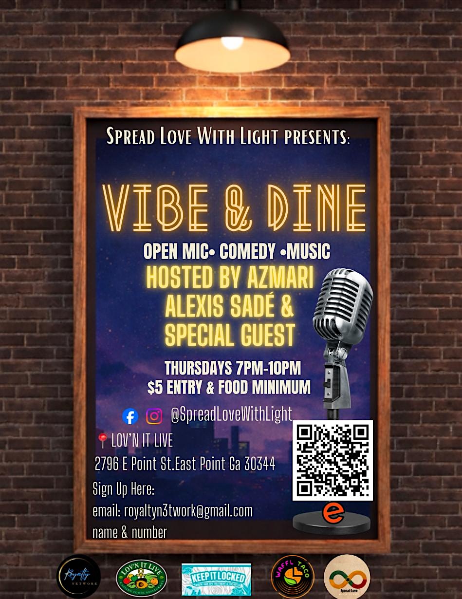 by admin27Feb Vibe & Dine at Lovin it Live – East Point, GA Vibe & Dine at Lovin it Live – East Point, GA 1 1 people viewed this event. Vibe & Dine, presented by Spread Love With Light: open mic for community upliftment! $5 entry, $15 food. Perform, vendor, sponsor? Email us! Tickets-RSVP Link Date And Time Thursday, April 2nd, 2026 07:00 PM (PST) Venue Lovin it Live Location 2796 East Point Street, East Point, GA 30344 Event Types Food & DrinkParty or Social Gathering Event Category AtlantaGeorgia Share With Friends Facebook Twitter Linkedin Xing Pinterest Share This Post: