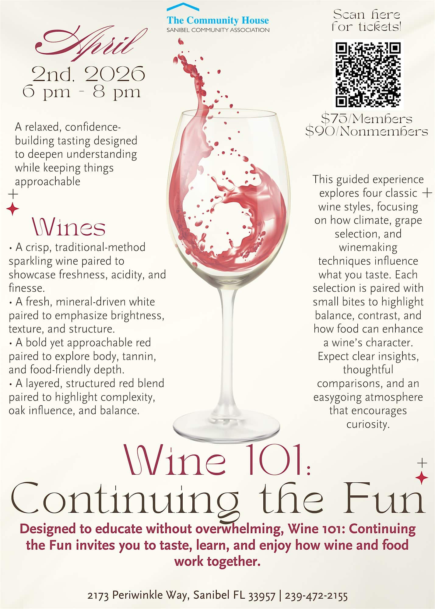 by admin14Feb Wine 101: Continuing The Fun at 2173 Periwinkle Way – Sanibel, FL Wine 101: Continuing The Fun at 2173 Periwinkle Way – Sanibel, FL 1 1 people viewed this event. A relaxed, confidence-building tasting designed to deepen understanding while keeping things approachable. Tickets-RSVP Link Date And Time Thursday, April 2nd, 2026 10:00 PM (PST) Venue 2173 Periwinkle Way Location 2173 Periwinkle Way, Sanibel, FL 33957 Event Types Food & Drink Event Category Florida Share With Friends Facebook Twitter Linkedin Xing Pinterest Share This Post: